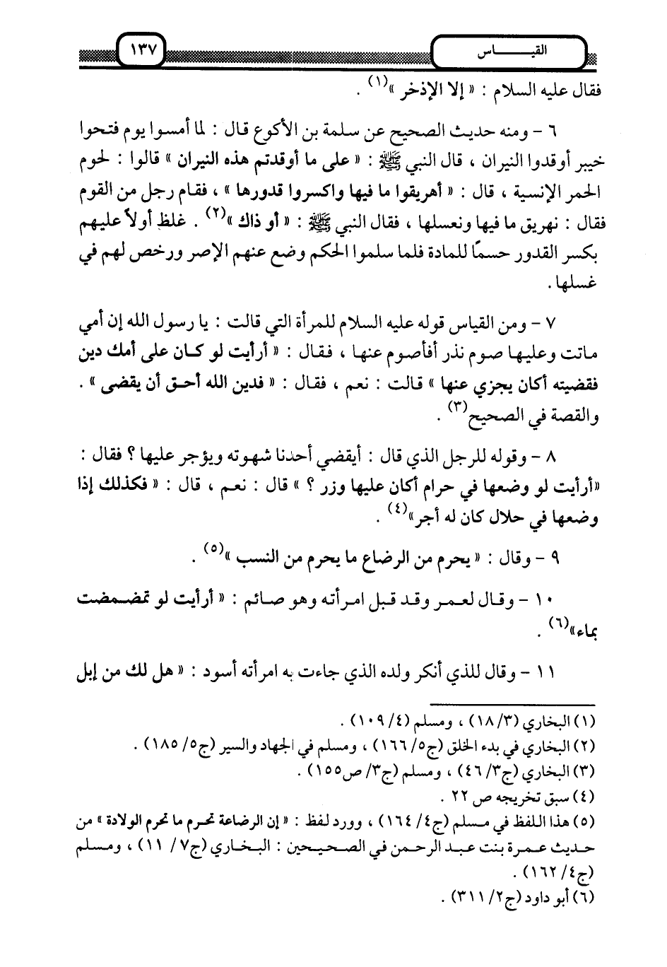 7- ومن القياس قوله -عليه السلام- للمرأة التي قالت: يا رسول الله, إن أمي ماتت وعليها صوم نذر أفأصوم عنها، فقال: "أرأيت لو كان على أمك دين فقضيته, أكان يجزي عنها" قالت: نعم، فقال: "فدين الله أحق أن يقضي".
