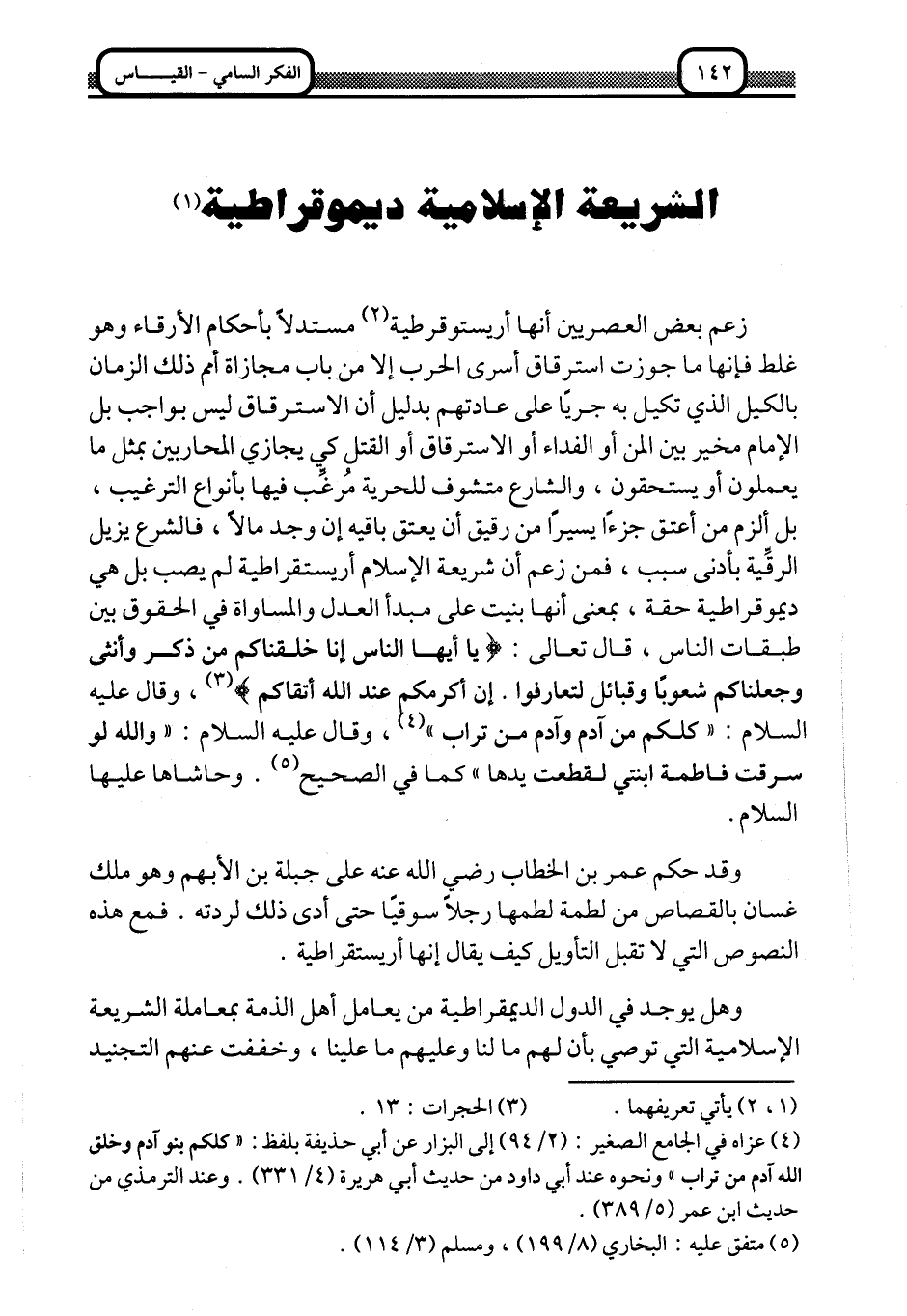 زعم بعض العصريين أنها أريستوقرطية2 مستدلًا بأحكام الأرقاء, وهو غلط, فإنها ما جوزت استرقاق أسرى الحرب إلّا من باب مجازاة أمم ذلك الزمان بالكيل الذي تكيل به جريًا على عادتهم, بدليل أن الاسترقاق ليس بواجب, بل الإمام مخيَّر بين المنِّ أو الفداء أو الاسترقاق أو القتل, كي يجازي المحاربين بمثل ما يعملون أن يستحقون، والشارع متشوّف للحرية, مرغِّب فيها بأنواع الترغيب، بل ألزم من أعتق جزءًا يسيرًا من رقيق أن يعتق باقيه إن وجد مالًا، فالشرع يزيل الرقِّية بأدنى سبب، فمن زعم أن شريعة الإسلام أريستوقراطية لم يصب, بل هي ديموقراطية حقة، بمعنى أنها بنيت على مبدأ العدل والمساواة في الحقوق بين طبقات الناس، قال تعالى: {يَا أَيُّهَا النَّاسُ إِنَّا خَلَقْنَاكُمْ مِنْ ذَكَرٍ وَأُنْثَى وَجَعَلْنَاكُمْ شُعُوبًا وَقَبَائِلَ لِتَعَارَفُوا إِنَّ أَكْرَمَكُمْ عِنْدَ اللَّهِ أَتْقَاكُمْ} 3، وقال -عليه السلام: "كلكم من آدم وآدم من تراب" 4، وقال -عليه السلام: "والله لو سرقت فاطمة ابنتي لقطعت يدها" كما في الصحيح5. وحاشاها -عليها السلام.
