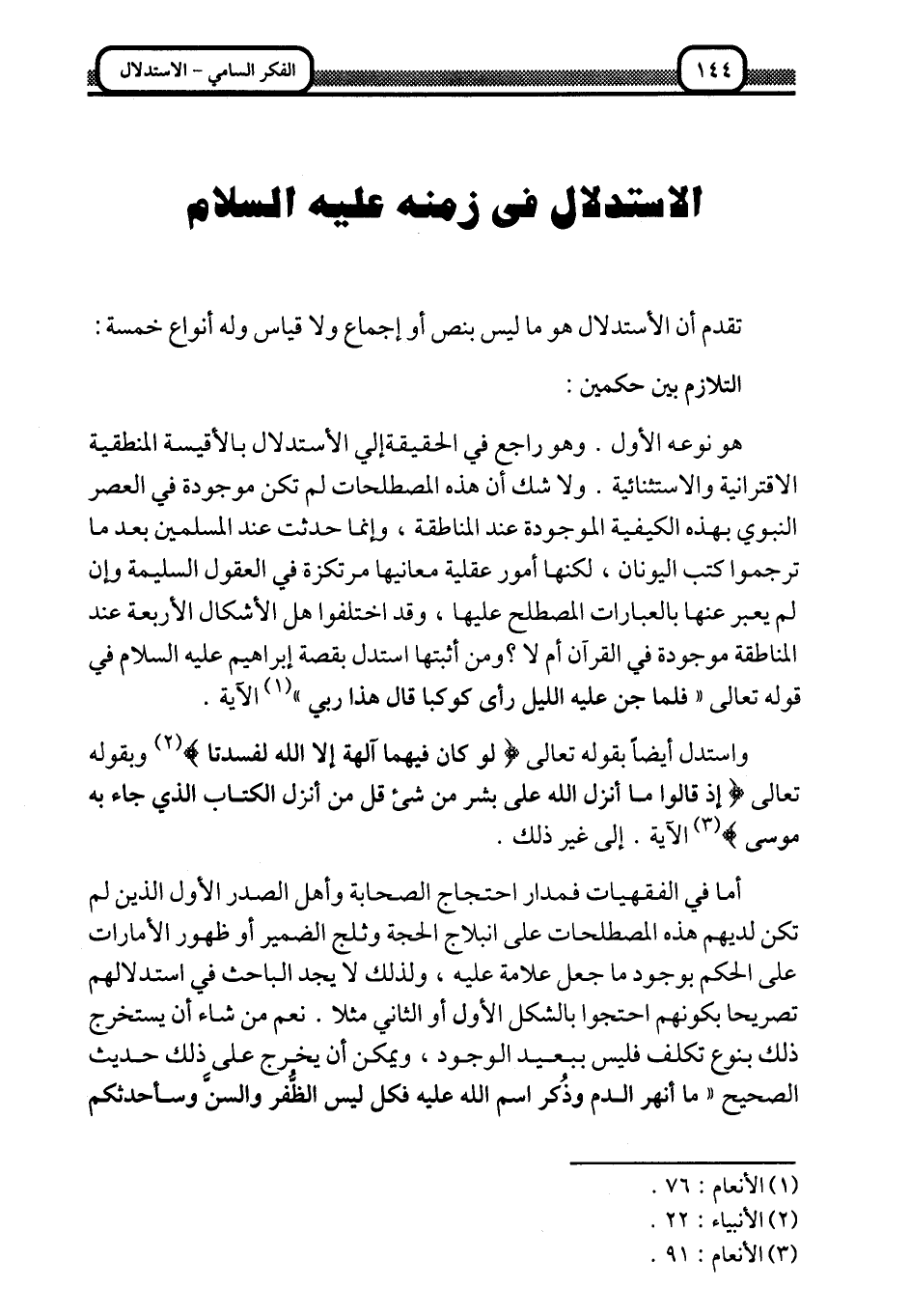 هو نوعة الأول, وهو راجع في الحقيقة إلى الاستدلال بالأقيسة المنطقية الاقترانية والاستثنائية, ولا شك أن هذه المصطلحات لم تكن موجودة في العصر النبوي بهذه الكيفية الموجودة عند المناطقة، وإنما حدثت عند المسلمين بعد ما ترجموا كتب اليونان، لكنها أمور عقلية, معانيها مرتكزة في العقول السليمة, وإن لم يعبر عنها بالعبارات المصطلح عليها، وقد اختلفوا: هل الأشكال الأربعة عند المناطقة موجودة في القرآن أم لا؟ ومن أثبتها استدل بقصة إبراهيم -عليه السلام- في قوله تعالى: {فَلَمَّا جَنَّ عَلَيْهِ اللَّيْلُ رَأَى كَوْكَبًا قَالَ هَذَا رَبِّي} 1 الآية.