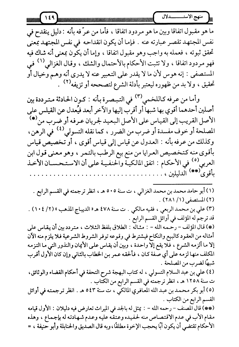 وأما من عرَّفَه كاللخمي3 في التبصرة بأنه: كون الحادثة مترددة بين أصلين أحدهما أقوى بها شبهًا أو أقرب إليها, والآخر أبعد, فيعدل عن القياس, على الأصل القريب إلى القياس على الأصل البعيد لجريان عرفه, أو ضرب من4 المصلحة, أو خوف مفسدة, أو ضرب من الضرر، كما نقله التسولي5 في الرهن، وكذلك من عرَّفه بأنه: العدول عن قياس إلى قياس أقوى، أو تخصيص قياس بأقوى منه؛ كتخصيص العرايا من منع بيع الرطب بالتمر، وهو معنى قول ابن العربي6 في الأحكام: اتفق المالكية والحنفية على أن الاستحسان الأخذ بأقوى7 الدليلين,..............................................