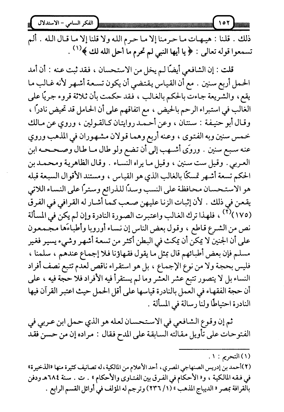 قلت: إن الشافعي أيضًا لم يخل من الاستحسان، فقد ثبت عنه: أن أمد الحمل أربع سنين, مع أن القياس يقتضي أن يكون تسعة أشهر؛ لأنه غالب ما يقع، والشريعة جاءت بالحكم بالغالب، فقد حكمت بأن ثلاثة قروء جريًا على الغالب في استبراء الرحم بالحيض، مع اتفاقهم على أن الحامل قد تحيض نادرًا، وقال أبو حنفية: سنتان، وعن أحمد روايتان كالقولين، وروي عن مالك: خمس سنين, وبه الفتوى، وعنه أربع, وهما قولان مشهوران في المذهب, وروي عنه سبع سنين, وروى أشهب إلى أن تضع ولو طال ما طال, وصحَّحَه ابن العربي. وقيل: ست سنين، وقيل: ما يراه النساء, وقال الظاهرية ومحمد بن الحكم: تسعة أشهر تمسكًا بالغالب الذي هو القياس, ومستند الأقوال السبعة قبله هو الاستحسان محافظةً على النسب, وسدًّا للذرائع, وسترًا على النساء اللاتي يقعن في ذلك؛ لأن إثبات الزنا عليهن صعب كما أشار له القرافي في الفرق "175"2، فلهذا ترك الغالب, واعتبرت الصورة النادرة وإن لم يكن في المسألة نص من الشرع قاطع، وقول بعض الناس: إن نساء أوربا وأطباءها مجمعون على أن الجنين لا يمكن أن يمكث في البطن أكثر من تسعة أشهر وشيء يسير فغير مسلّم, فإن بعض أطبائهم قال بمثل ما يقول فقهاؤنا, فلا إجماع عندهم، سلمنا، فليس بحجة ولا من نوع الإجماع، بل هو استقراء ناقص لعدم تتبع نصف أفراد النساء, بل لا يتصور تتبع عشر العشر, وما لم يستقرأ فيه الأفراد فلا حجة فيه، على أن حجة الفقهاء في العمل بالنادرة قياسها على أقل الحمل, حيث اعتبر القرآن فيه النادرة احتياطًا, ولنا رسالة في المسألة.