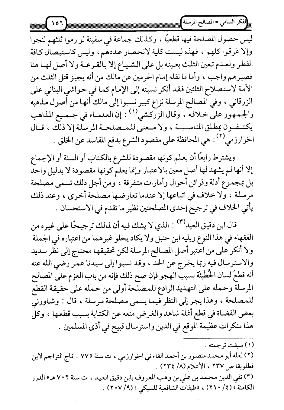 قال ابن دقيق العيد3: الذي لا يشك فيه أن لمالك ترجيحًا على غيره من الفقهاء في هذا النوع, ويليه ابن حنبل, ولا يكاد يخلو غيرهما من اعتباره في الجملة, ولا أنكر على من اعتبر أصل المصالح المرسلة, لكن تحقيقها محتاج إلى نظر سديد, والاسترسال فيه ربما يخرج عن الحد، وقد نسبوا إلى سيدنا عمر -رضي الله عنه- أنه قطع لسان الحطيئة بسب الهجو, فإن صح ذلك فإنه من باب العزم على المصالح المرسلة, وحمله على التهديد الرادع للمصلحة أولى من حمله على حقيقة القطع للمصلحة، وهذا يجر إلى النظر فيما يسمَّى مصلحة مرسلة، قال: وشاورني بعض القضاة في قطع أنملة شاهد, والغرض منعه عن الكتابة بسبب قطعها، وكل هذا منكرات عظيمة الموقع في الدين, واسترسال قبيح في أذى المسلمين.