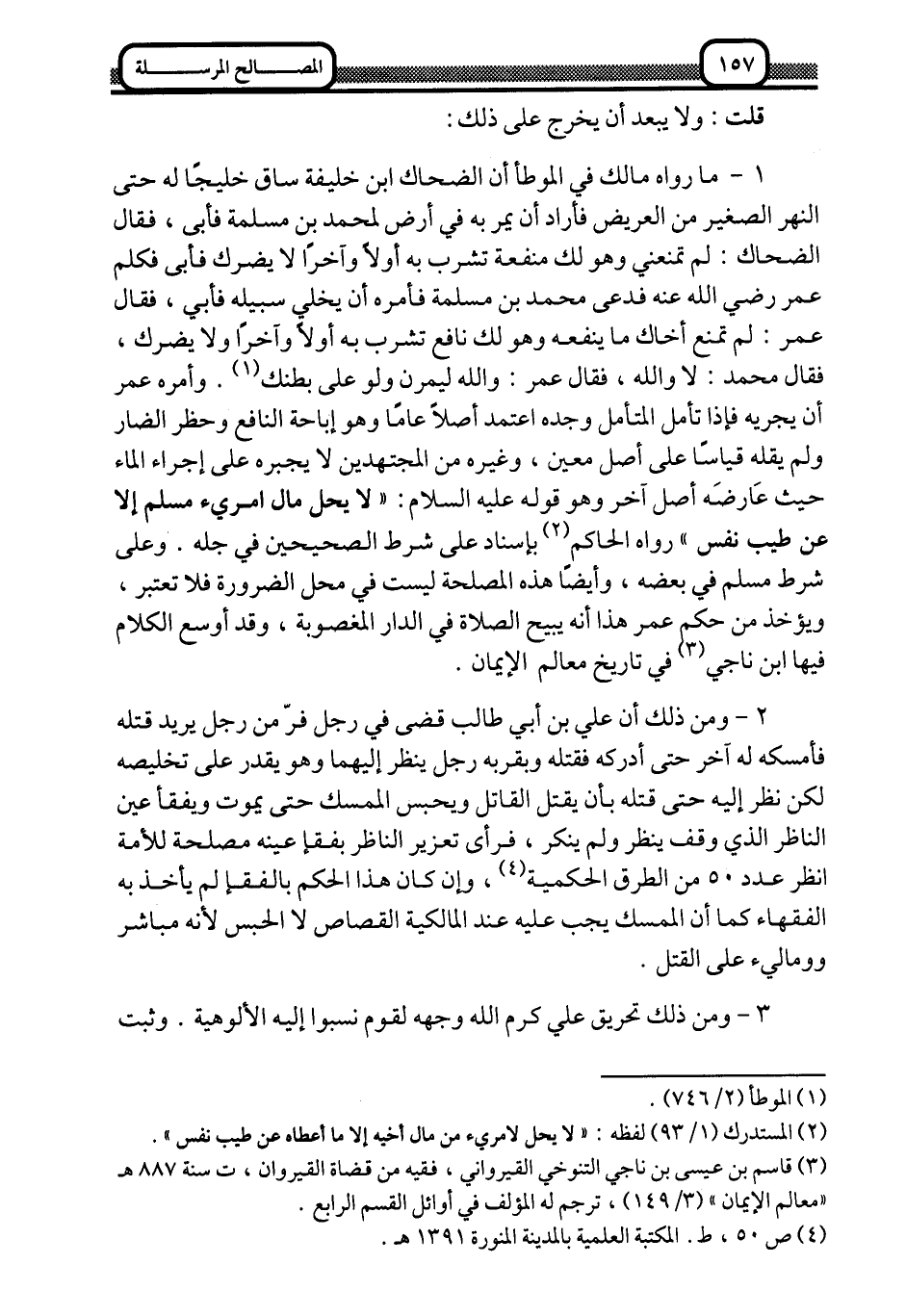 1- ما رواه مالك في الموطأ أن الضحاك ابن خليفة ساق خليجًا له حتى النهر الصغير من العريض, فأراد أن يمر به في أرض لمحمد بن مسلمة فأبى، فقال الضحاك: لم تمنعني وهو لك منفعة تشرب به أولًا وآخرًا ولا يضرك, فأبى, فكلَّم عمر -رضي الله عنه- فدعى محمد بن مسلمة فأمره أن يخلي سبيله فأبى، فقال عمر: لم تمنع أخاك ما ينفعه وهو لك نافع تشرب به أولًا وآخرًا, ولا يضرك، فقال محمد: لا والله، فقال عمر: والله ليمرنَّ ولو على بطنك1. وأمره عمر أن يجريه, فإذا تأمَّل المتأمل وجده اعتمد أصلًا عامًّا وهو إباحة النافع وحظر الضار, ولم يقله قياسًا على أصل معين، وغيره من المجتهدين لا يجبره على إجراء الماء؛ حيث عارضه أصل آخر وهو قوله -عليه السلام: "لا يحل مال امريء مسلم إلّا عن طيب نفس" رواه الحاكم2 بإسناد على شرط الصحيحين في جله, وعلى شرط مسلم في بعضه، وأيضًا هذه المصلحة ليست في محل الضرروة فلا تعتبر، ويؤخذ من حكم عمر هذا أنه يبيح الصلاة في الدار المغصوبة، وقد أوسع الكلام فيها ابن ناجي3 في تاريخ معالم الإيمان.