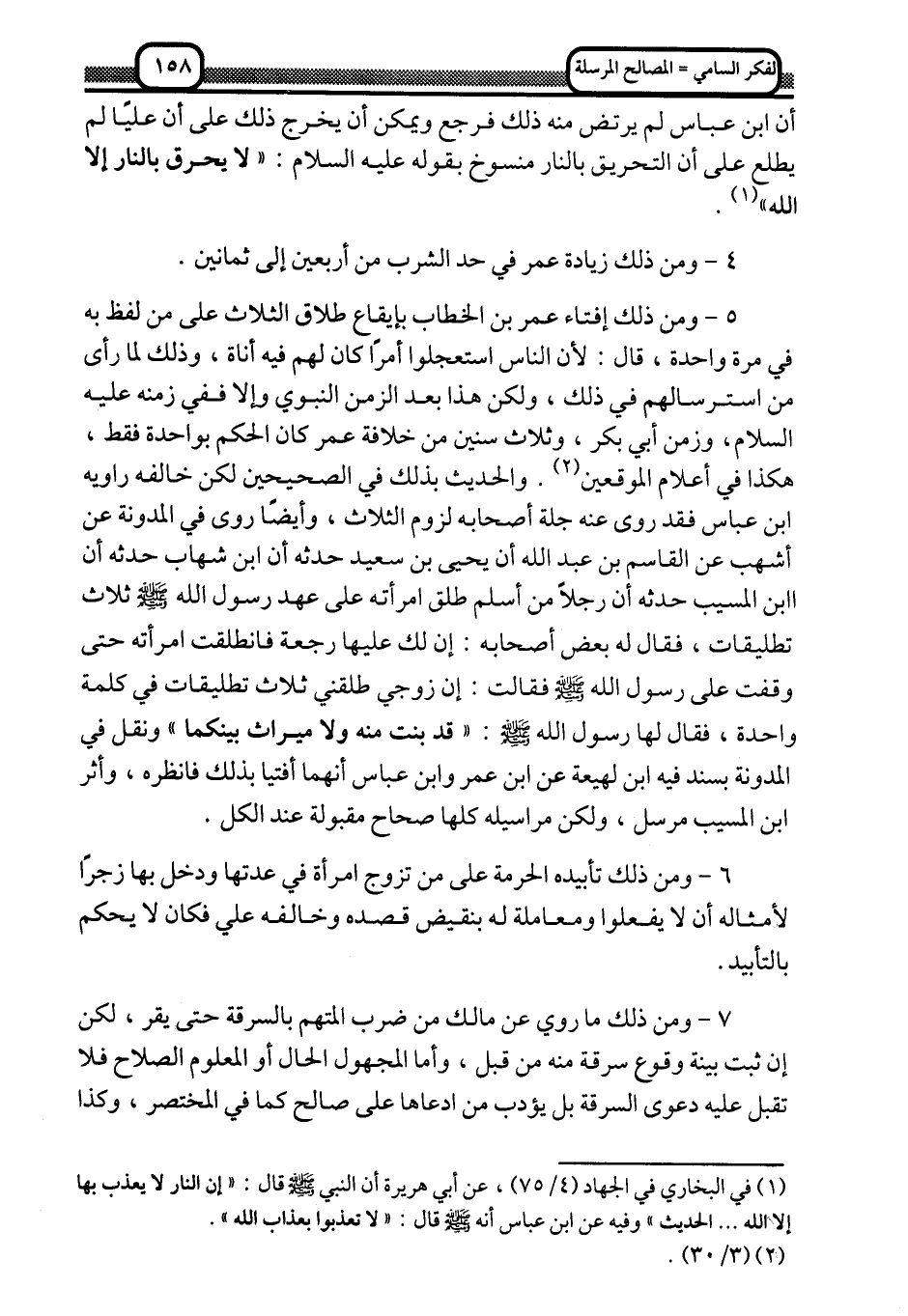 5- ومن ذلك إفتاء عمر بن الخطاب بإيقاع طلاق الثلاث على من لفظه به في مرة واحدة، قال: لأن الناس استعجلوا أمرًا كان لهم فيه أناة، وذلك لما رأى من استرسالهم في ذلك، ولكن هذا بعد الزمن النبوي وإلّا ففي زمنه -عليه السلام، وزمن أبي بكر، وثلاث سنين من خلافة عمر, كان الحكم بواحدة فقط، هكذا في أعلام الموقعين2. والحديث بذلك في الصحيحين لكن خالفه روايه ابن عباس, فقد روى عنه جلة أصحابة لزوم الثلاث، وأيضًا روى في المدونة عن أشهب عن القاسم بن عبد الله أن يحيى بن سعيد حدَّثه أن ابن شهاب حدَّثه أن ابن المسيب حدَّثه أن رجلًا من أسلم طلَّق امرأته على عهد رسول الله -صلى الله عليه وسلم- ثلاث تطليقات، فقال له بعض أصحابه، إن لك عليها رجعة فانطلبت امرأته حتى وقفت على رسول الله -صلى الله عليه وسلم- فقالت: إن زوجي طلقني ثلاث تطلقيات في كلمة واحدة، فقال له رسول الله -صلى الله عليه وسلم: "قد بنت منه ولا ميراث بينكما" , ونقل في المدونة بسند فيه ابن لهيعة عن ابن عمر وابن عباس أنهما أفتيا بذلك فانظره، وأثر ابن المسيب مرسل، ولكن مراسيله كلها صحاح مقبولة عند الكل.