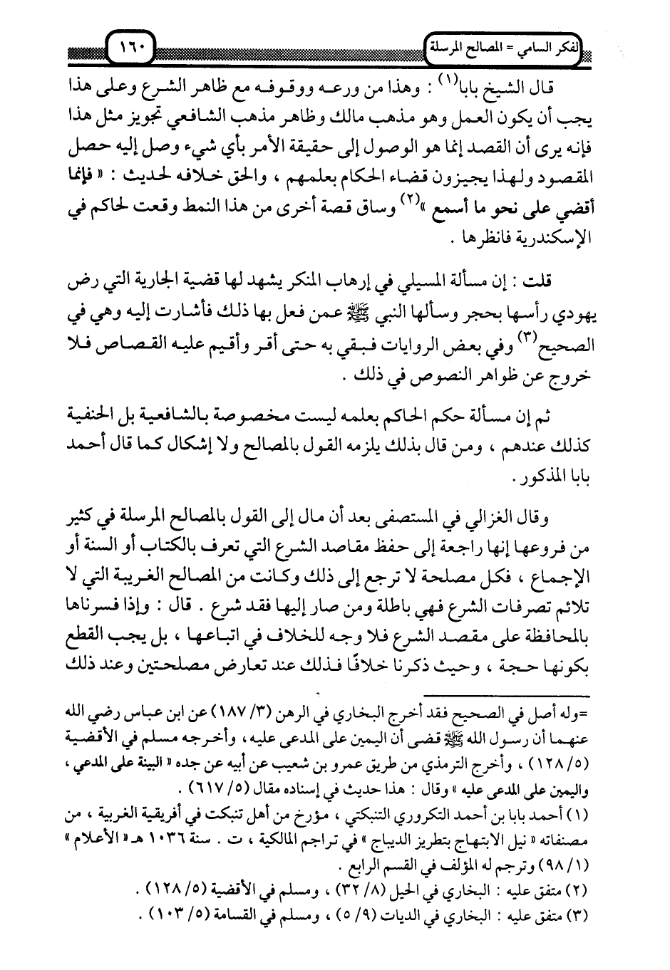 ثم إن مسألة حكم الحاكم بعلمه ليست مخصوصة بالشافعية بل الحنفية كذلك عندهم، ومن قال بذلك يلزمه القول بالمصالح, ولا إشكال كما قال أحمد بابا المذكور.
