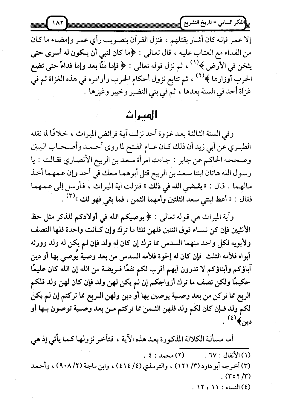 وفي السنة الثالثة بعد غزوة أحد نزلت آية فرائض الميراث، خلافًا لما نقله الطبري عن أبي زيد أن ذلك كان عام الفتح, لما روى أحمد وأصحاب السن وصحَّحه الحاكم عن جابر: جاءت امرأة سعد بن الربيع الأنصاري فقالت: يا رسول الله, هاتان ابنتا سعد بن الربيع, قتل أبوهما معك في أحد, وإن عمهما أخذ مالهما, قال: "يقضي الله في ذلك" , فنزلت آية الميراث, فأرسل إلى عمهما فقال: "أعط ابنتي سعد الثلثين, وأمهما الثمن، فما بقي فهو لك" 1.