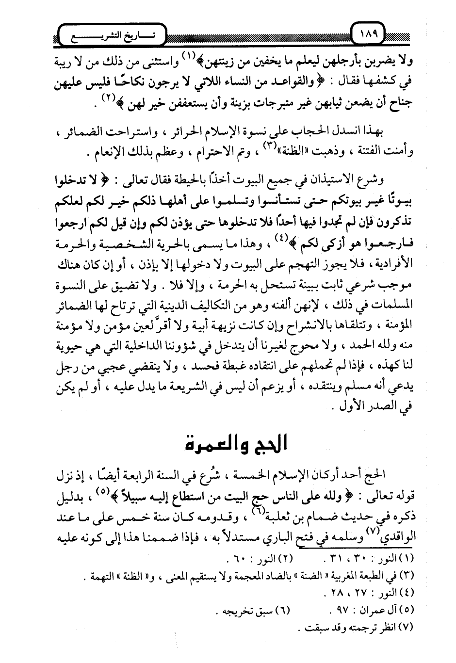 وشرع الاستيذان في جميع البيوت أخذًا بالحيطة فقال تعالى: {لا تَدْخُلُوا بُيُوتًا غَيْرَ بُيُوتِكُمْ حَتَّى تَسْتَأْنِسُوا وَتُسَلِّمُوا عَلَى أَهْلِهَا ذَلِكُمْ خَيْرٌ لَكُمْ لَعَلَّكُمْ تَذَكَّرُونَ, فَإِنْ لَمْ تَجِدُوا فِيهَا أَحَدًا فَلا تَدْخُلُوهَا حَتَّى يُؤْذَنَ لَكُمْ وَإِنْ قِيلَ لَكُمُ ارْجِعُوا فَارْجِعُوا هُوَ أَزْكَى لَكُم} 4، وهذا ما يسمَّى بالحرية الشخصية والحرمة الأفرادية، فلا يجوز التهجم على البيوت ولا دخولها إلّا بإذن، أو إن كان هناك موجب شرعي ثابت ببينة تستحل به الحرمة، وإلّا فلا، ولا تضيق على النسوة المسلمات في ذلك، لإنهن ألفنه وهو من التكاليف الدينية التي ترتاح لها الضمائر المؤمنة، وتتلقاها بالانشراح وإن كانت نزيهة أبية, ولا أقرَّ لعين مؤمن ولا مؤمنة منه ولله الحمد، ولا محوج لغيرنا أن يتدخل في شئوننا الداخلية التي هي حيوية لنا كهذه، فإذا لم تحمله على انتقاده غبطة فحسد، ولا ينقضي عجبي من رجل يدعي أنه مسلم وينتقده، أو يزعم أن ليس في الشريعة ما يدل عليه، أو لم يكن في الصدر الأول.