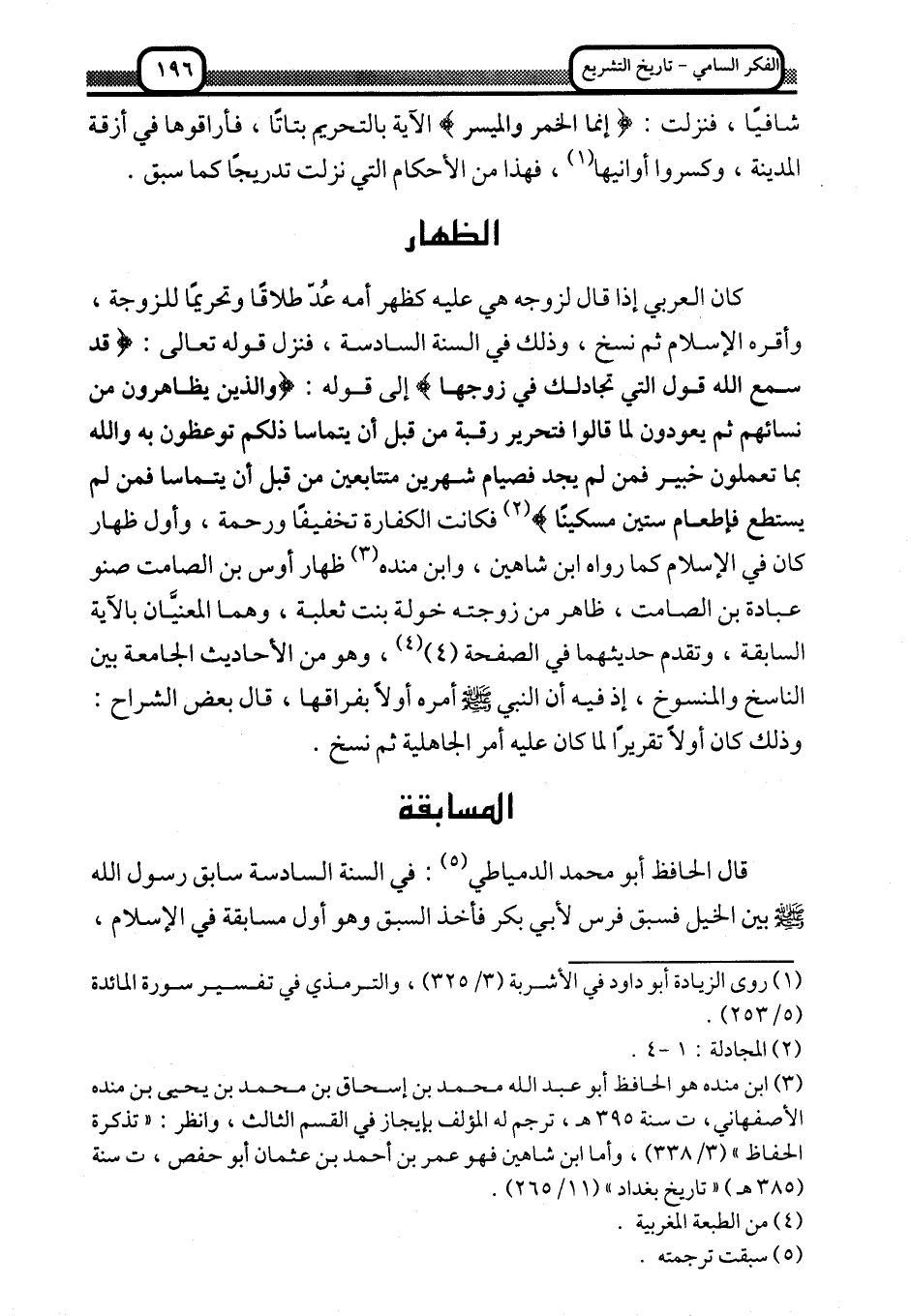 كان العربي إذا قال لزوجه: هي عليه كظهر أمه, عد طلاقًا وتحريمًا للزوجة، وأقرَّه الإسلام ثم نسخ، وذلك في السنة السادسة، فنزل قوله تعالى: {وَالَّذِينَ يُظَاهِرُونَ مِنْ نِسَائِهِمْ ثُمَّ يَعُودُونَ لِمَا قَالُوا فَتَحْرِيرُ رَقَبَةٍ مِنْ قَبْلِ أَنْ يَتَمَاسَّا ذَلِكُمْ تُوعَظُونَ بِهِ وَاللَّهُ بِمَا تَعْمَلُونَ خَبِيرٌ, فَمَنْ لَمْ يَجِدْ فَصِيَامُ شَهْرَيْنِ مُتَتَابِعَيْنِ مِنْ قَبْلِ أَنْ يَتَمَاسَّا فَمَنْ لَمْ يَسْتَطِعْ فَإِطْعَامُ سِتِّينَ مِسْكِينًا} 2 فكانت الكفارة تخفيفًا ورحمة، وأول ظهار كان في الإسلام كما رواه ابن شاهين وابن منده3, ظهار أوس بن الصامت صنو عبادة بن الصامت، ظاهر من زوجته خولة بنت ثعلبة، وهما المعنيان بالآية السابقة, وتقدَّم حديثهما في الصفحة 4، 4 وهو من الأحاديث الجامعة بين الناسخ والمنسوخ، إذ فيه أن النبي -صلى الله عليه وسلم- أمره أولًا بفراقها، قال بعض الشراح: وذلك كان أولًا تقريرًا لما كان عليه أمر الجاهلية ثم نسخ.