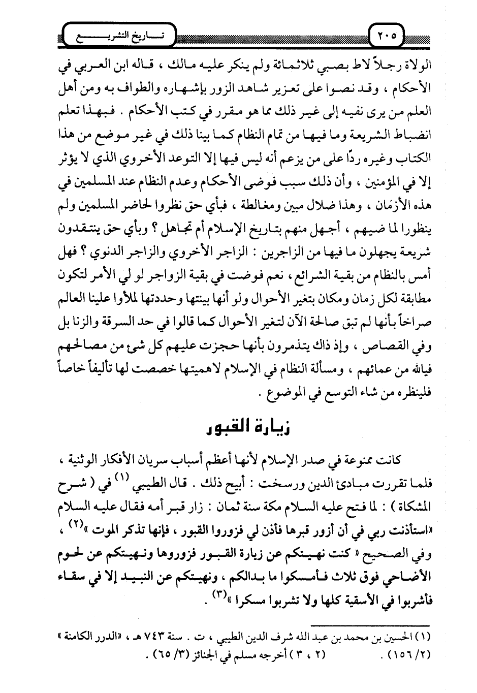 كانت ممنوعة في صدر الإسلام لأنها أعظم أسباب سريان الأفكار الوثنية، فلما تقررت مبادئ الدين ورسخت أبيخ ذلك. قال الطيبي1 في "شرح المشكاة": لم فتح -عليه السلام- مكة سنة ثمان, زار قبر أمه فقال -عليه السلام: "استأذنت ربي في أن أزور قبرها فأذن لي, فزوروا القبور، فإنها تذكر الموت" 2، وفي الصحيح: "كنت نهيتكم عن زيارة القبور فزوروها, ونهيتكم عن لحوم الأضاحي فوق ثلاث فأمسكوا ما بدا لكم، ونهيتكم عن النبيذ إلّا في سقاءٍ فأشربوا في الأسقية كلها ولا تشربوا مسكرًا" 3.