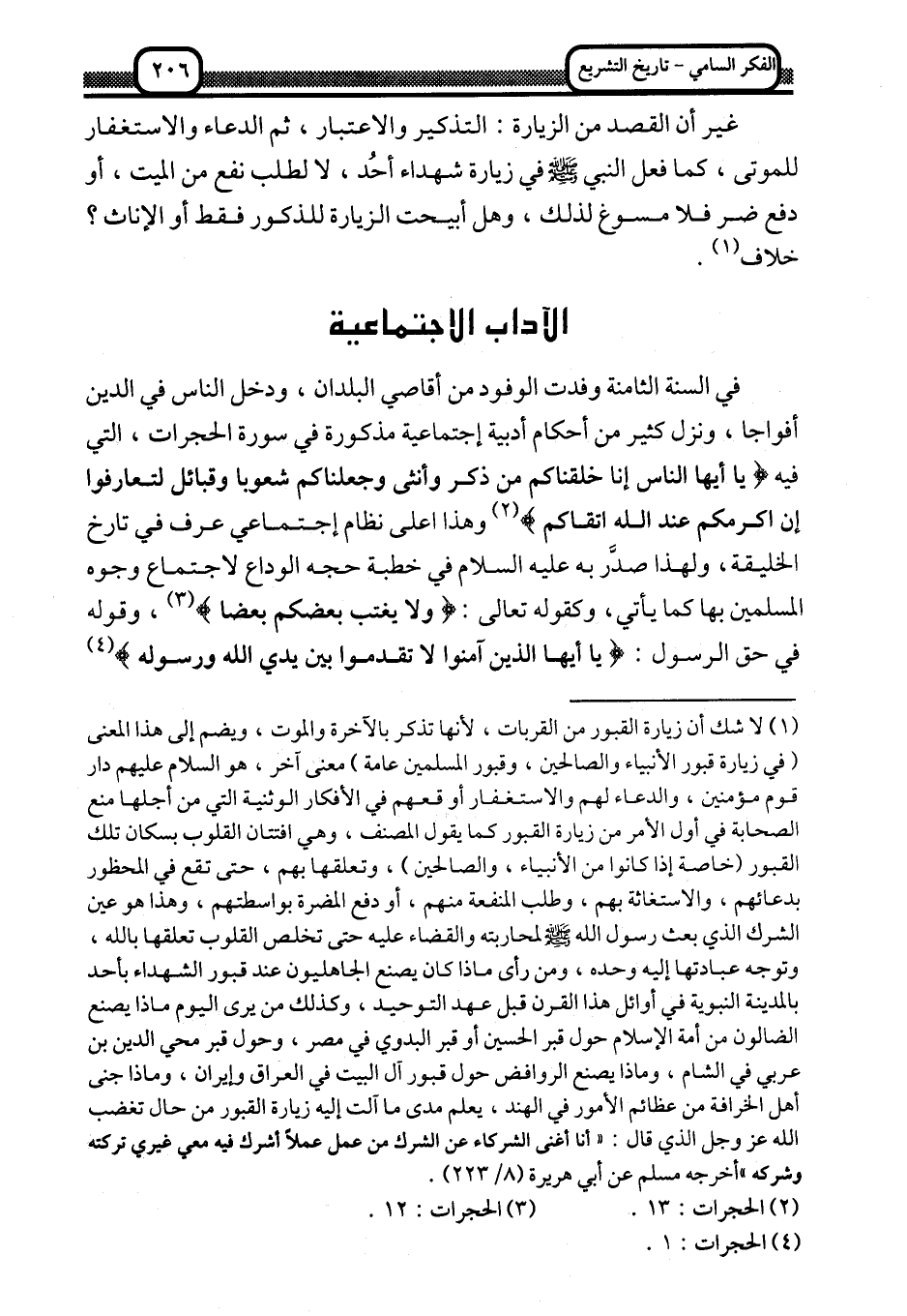 1 لا شك أن في زيارة القبور من القربان، لأنها تذكر بالآخرة والموت، ويضم إلى هذا المعنى "في زيارة قبور الأنبياء والصالحين، وقبور المسلمين عامة" معنى آخر، هو السلام عليهم دار قوم مؤمنين، والدعاء لهم والاستغفار أوقعهم في الأفكار الوثنية التي من أجلها منع الصحابة في أول الأمر من زيارة القبور كما يقول المصنف، وهي افتتان القلوب بسكَّان تلك القبور "خاصة إذا كانوا من الأنبياء، والصالحين"، وتعلقها بهم، حتى تقع في المحظور بدعائهم، والاستغاثة بهم، وطلب المنفعة منهم، أو دفع المضرة بواسطتهم، وهذا هو عين الشرك الذي بُعِثَ رسول الله -صلى الله عليه وسلم- لمحاربته والقضاء عليه, حتى تخلص القلوب تعلقها بالله، وتوجّه عبادتها إليه وحده، ومن رأى ماذا كان يصنع الجاهليون عند قبور الشهداء بأحد بالمدينة النبوية في أوائل هذا القرن قبل عهد التوحيد، وكذلك من يرى اليوم ماذا يصنع الضالون من أمة الإسلام حول قبر الحسين أو قبر البدوي في مصر، وحول قبر محي الدين بن عربي في الشام، وماذا يصنع الروافض حول قبور آل البيت في العراق وإيران، وماذا جنى أهل الخرافة من عظائم الأمور في الهند، يعلم مدى ما آلت إليه زيارة القبور من حالٍ تغضب الله -غز وجل- الذي قال: "أنا أغنى الشركاء عن الشرك, من عمل علمًا أشرك به معي غيري تركته وشركه" أخرجه مسلم عن أبي هريرة "8/ 223".