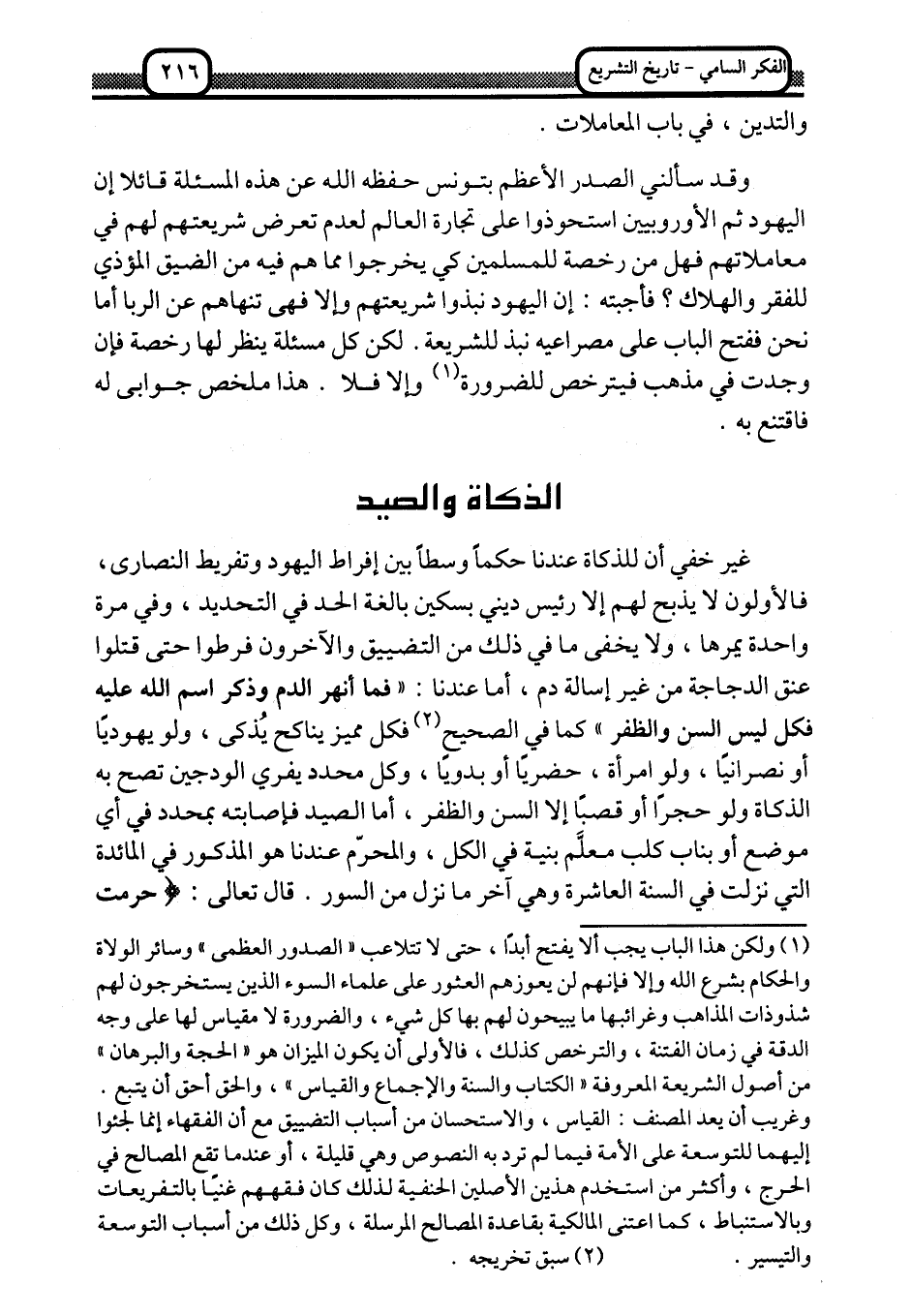 وقد سألني الصدر الأعظم بتونس -حفظه الله- عن هذه المسألة قائلًا: إن اليهود ثم الأوروبيين استحوذوا على تجارة العالم لعدم تعرض شريعتهم لهم في معاملاتهم, فهل من رخصة للمسلمين كي يخرجوا مما هم فيه من الضيق المؤدي للفقر والهلاك؟ فأجبته: إن اليهود نبذوا شريعتهم وإلّا فهي تنهاهم عن الربا, أما نحن ففتح الباب على مصراعيه نبذ للشريعة. لكن كل مسألة ينظر لها رخصة, فإن وجدت في مذهب فيترخّص للضرورة1 وإلا فلا. هذا ملخص جوابي له فاقتنع به.