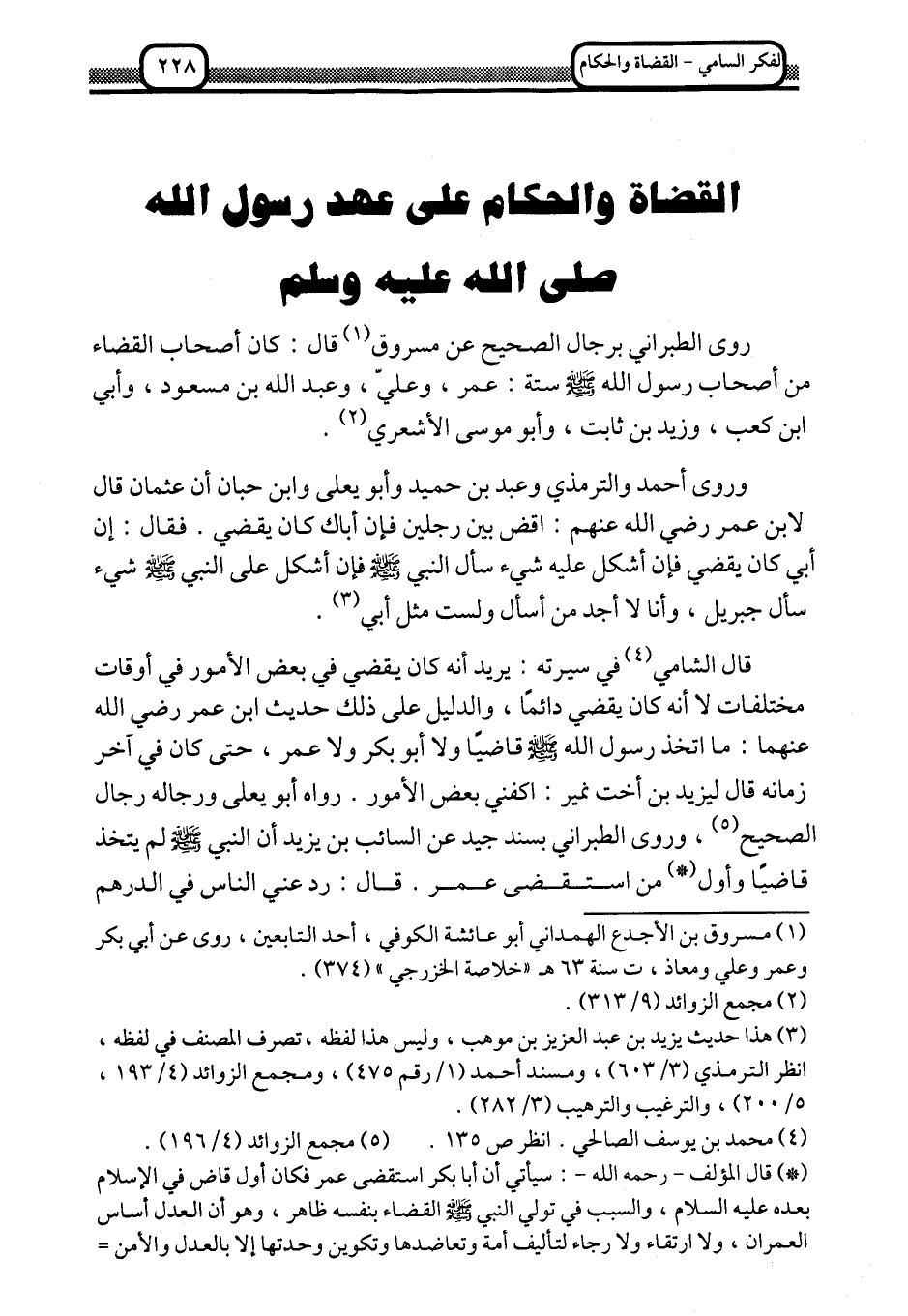 روى الطبراني برجال الصحيح عن مسروق1 قال: كان أصحاب القضاء من أصحاب رسول الله -صلى الله عليه وسلم- ستة: عمر، وعلي، وعبد الله بن مسعود، وأُبَيّ ابن كعب، وزيد بن ثابت، وأبو موسى الأشعري2.