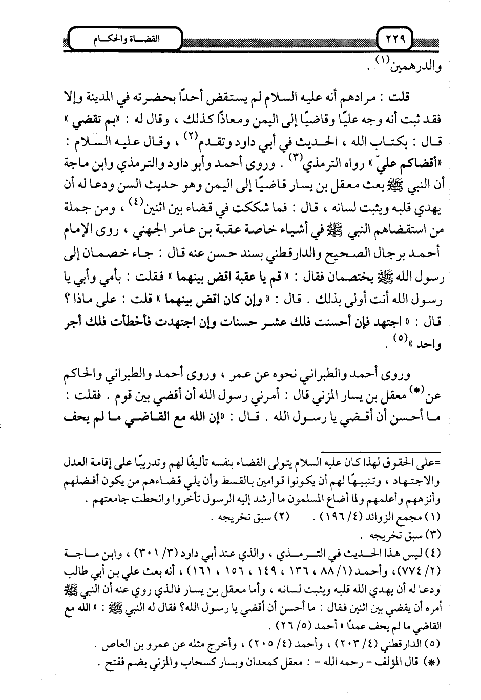 4 ليس هذا الحديث في الترمذي، والذي عند أبي داود "3/ 301"، وابن ماجة "2/ 774"، وأحمد "1/ 88، 136، 149، 156، 161"، أنه بعث علي بين أبي طالب ودعا له أن يهدي الله قلبه ويثبت فؤاده, وأما معقل بن يسار فالذي روي عنه أن النبي -صلى الله عليه وسلم- أمره أن يقضي بين اثنين فقال: ما أحسن أن أقضي يا رسول الله؟ قال له النبي -صلى الله عليه وسلم: "الله مع القاضي ما لم يحف عمدًا" أحمد "5/ 26".