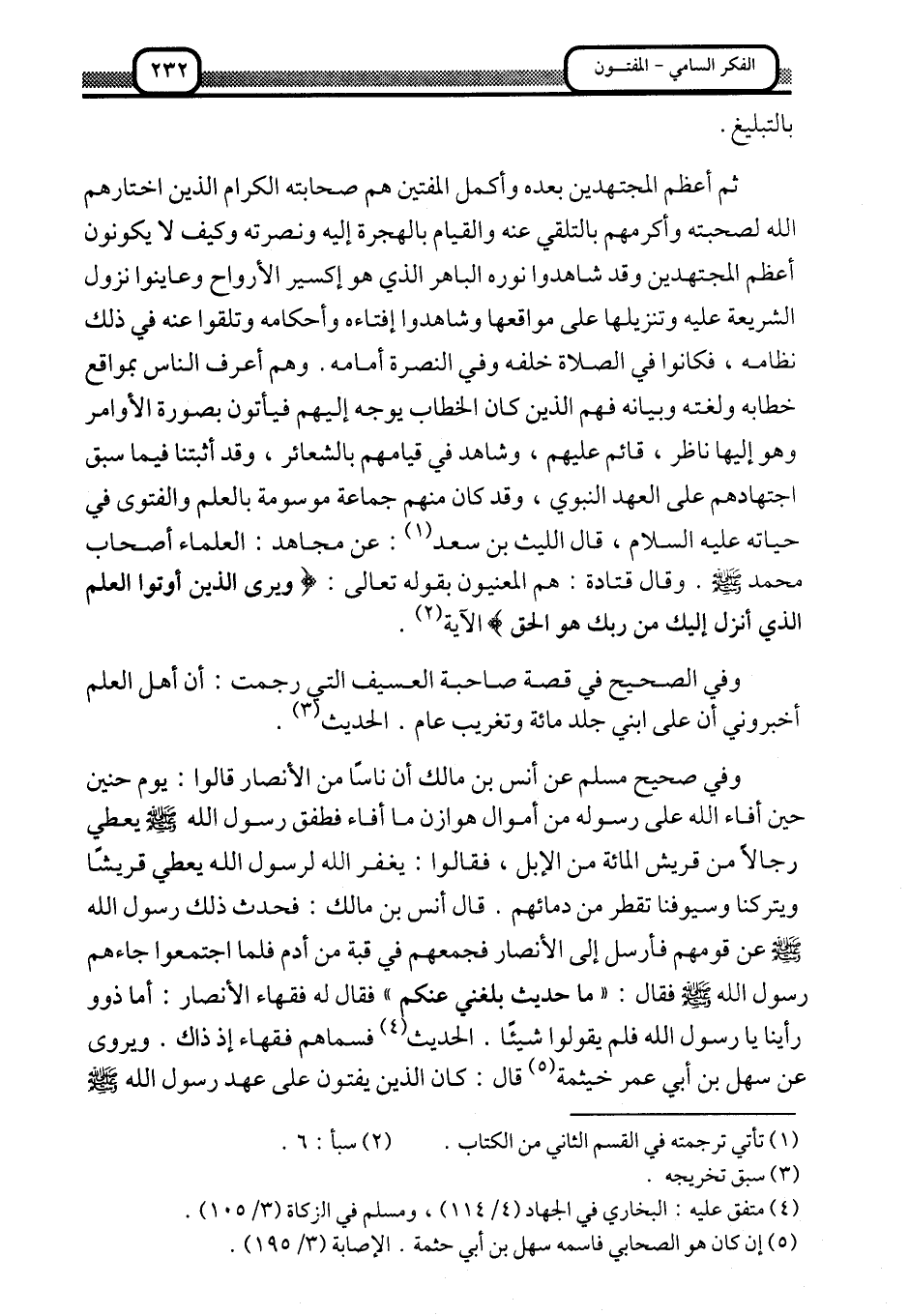 وفي صحيح مسلم عن أنس بن مالك أن ناسًا من الأنصار قالوا يوم حنين حين أفاء الله على رسوله من أموال هوازن ما أفاء, فطفق رسول الله -صلى الله عليه وسلم- يعطي رجالًا من قريش المائة من الإبل، فقالوا: يغفر الله لرسول الله, يعطي قريشًا ويتركنا, وسيوفنا تقطر من دمائهم. قال أنس بن مالك: فحدث ذلك رسول الله -صلى الله عليه وسلم- عن قومهم, فأرسل إلى الأنصار فجمعهم في قبة من أدم, فلما اجتمعوا جاءهم رسول الله -صلى الله عليه وسلم- فقال: "ما حديث بلغني عنكم" فقال له فقهاء الأنصار: أما ذوو رأينا يا رسول الله لم يقولوا شيئًا. الحديث4, فسماهم فقهاء إذ ذاك, ويروى عن سهل بن أبي عمر خيثمة5 قال: كان الذين يفتون على عهد رسول الله -صلى الله عليه وسلم