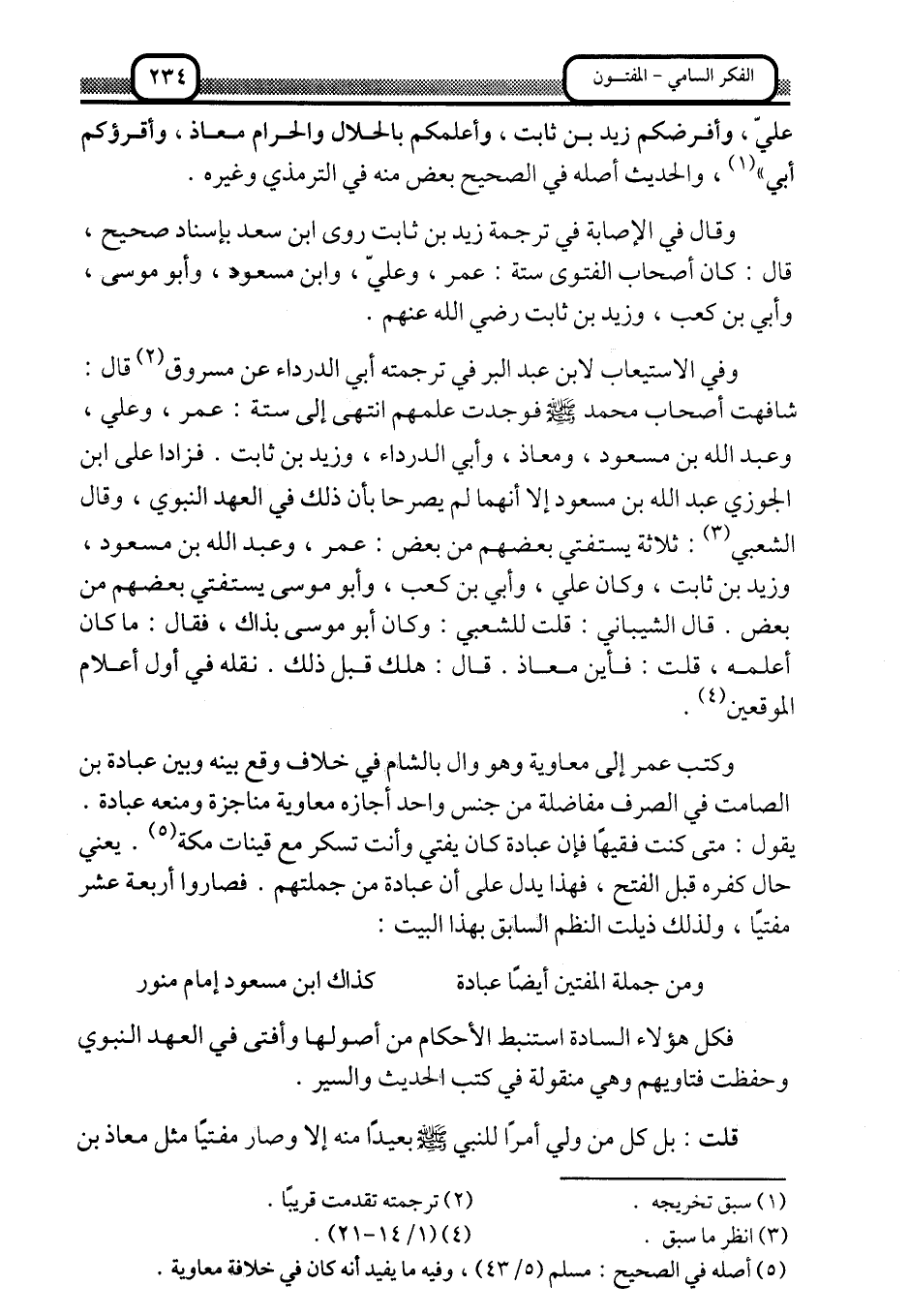 وقال في الإصابة في ترجمة زيد بين ثابت: روى ابن سعد بإسناد صحيح، قال: كان أصحاب الفتوى ستة، عمر، وعليّ، وابن مسعود، وأبو موسى، وأُبَيّ بن كعب، وزيد بن ثابت -رضي الله عنهم.