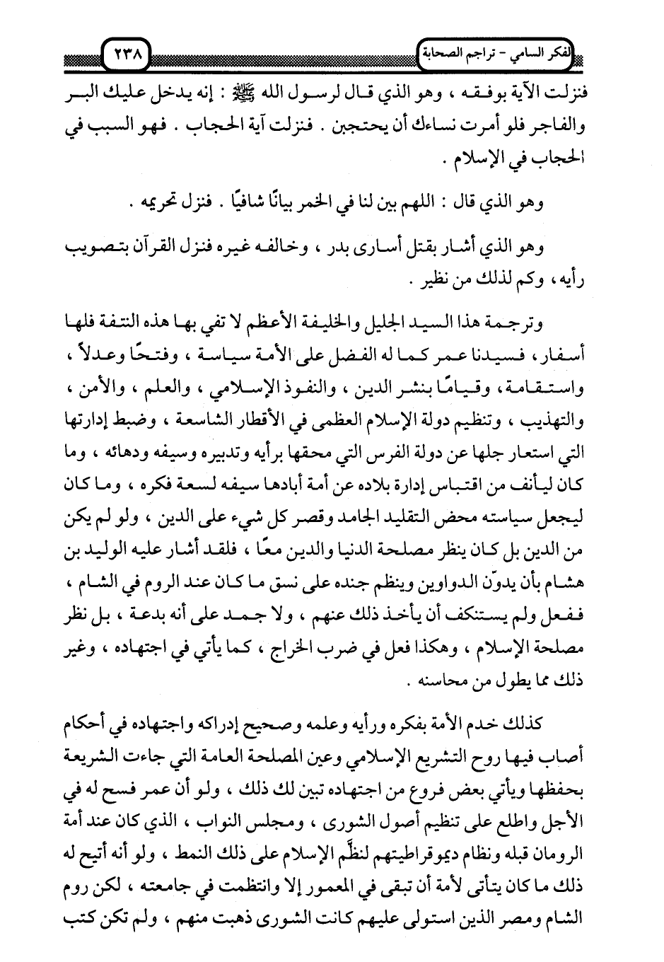كذلك خدم الأمة بفكرة ورأيه وعلمه وصحيح إدراكه واجتهاد في أحكام أصاب فيها روح الترشيع الإسلامي, وعين المصلحة العامة التي جاءت الشريعة بحفظها, ويأتي بعض فروع من اجتهاده تبين لك ذلك، ولو أن عمر فسح له في الأجل واطَّلع على تنظيم أصول الشورى، ومجلس النواب، الذي كان عند أمة الرومان قبله, ونظام ديموقراطيتهم لنظَّم الإسلام على ذلك النمط، ولو أنه أتيح له ذلك ما كان يتأتى لأمة أن يبقى في المعمور إلا وانتظمت في جامعته، لكن روم الشام ومصر الذين استولى عليهم كانت الشورى ذهبت منهم، ولم تكن كتب