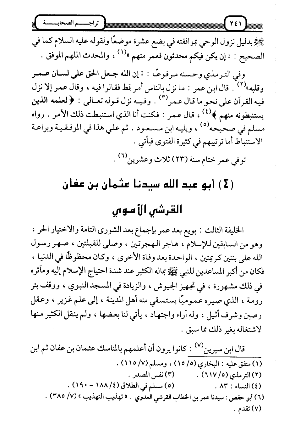 الخليفة الثالث: بويع بعد عمر بإجماع بعد الشورى التامة والاختيار الحر، وهو من السابقين للإسلام، هاجر الهجرتين، وصلى للقبلتين، وصهر رسول الله على بنتين كريمتين، الواحدة بعد وفاة الأخرى، وكان محظوظًا في الدنيا؛ فكان من أكبر المساعدين للنبي -صلى الله عليه وسلم- بماله الكثير عند شدة احتياج الإسلام إليه, ومآثره في ذلك مشهورة، في تجهيز الجيوش، والزيادة في المسجد النبوي، ووقف بئر رومة، الذي صيَّره عموميًّا يستسقي منه أهل المدينة، إلى علم غزير، وعقل رصين, وشرف أثيل، وله آراء واجتهاد يأتي لنا بعضها، ولم ينقل الكثير منها لاشتغاله بغير ذلك مما سبق.