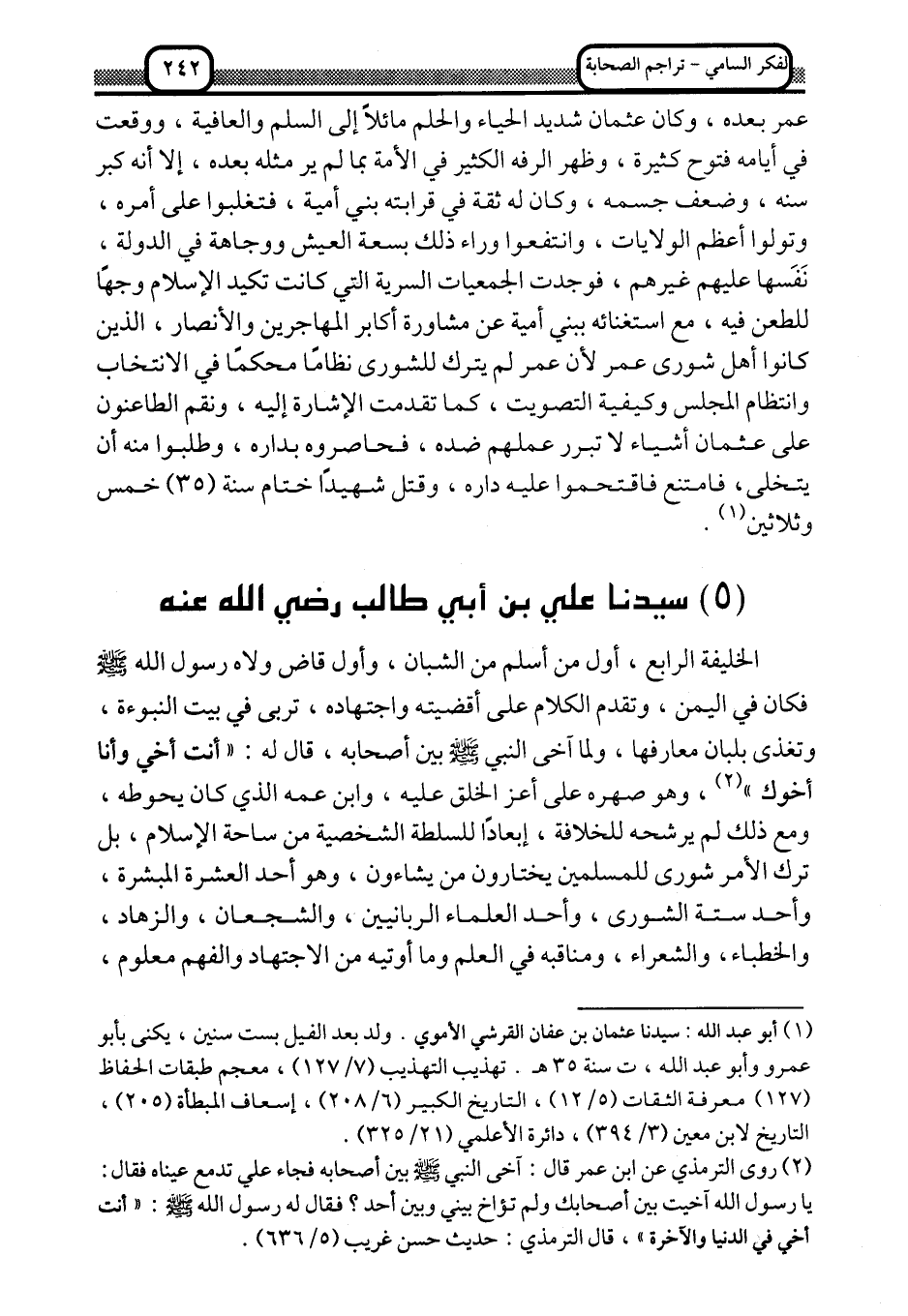 عمر بعده، وكان عثمان شديد الحياء والحلم, مائلًا إلى السلم والعافية، ووقعت في أيامه فتوح كثيرة، وظهر الرفه الكثيرة في الأمة بما لم ير مثله بعده، إلا أنه كبر سنه، وضعف جسمه، وكان له ثقة في قرابته بني أمية، فتغلَّبوا على أمره، وتولوا أعظم الولايات، وانتفعوا وراء ذلك بسعة العيش ووجاهة في الدولة، نَفَسها عليهم غيرهم، فوجدت الجمعيات السرية التي كانت تكيد الإسلام وجهًا للطعن فيها، مع استغنائه ببني أمية عن مشاروة أكابر المهاجرين والأنصار، الذين كانوا أهل شورى عمر؛ لأن عمر لم يترك للشورى نظامًا محكمًا في الانتخاب, وانتظام المجلس وكيفية التصويت، كما تقدمت الإشارة إليه، ونقم الطاعنون على عثمان أشياء لا تبرر عملهم ضده، فحاصروه بداره، وطلبوا منه أن يتخلى، فامتنع فاقتحموا عليه داره، وقتل شهيدًا ختام سنة "35" خمس وثلاثين1.