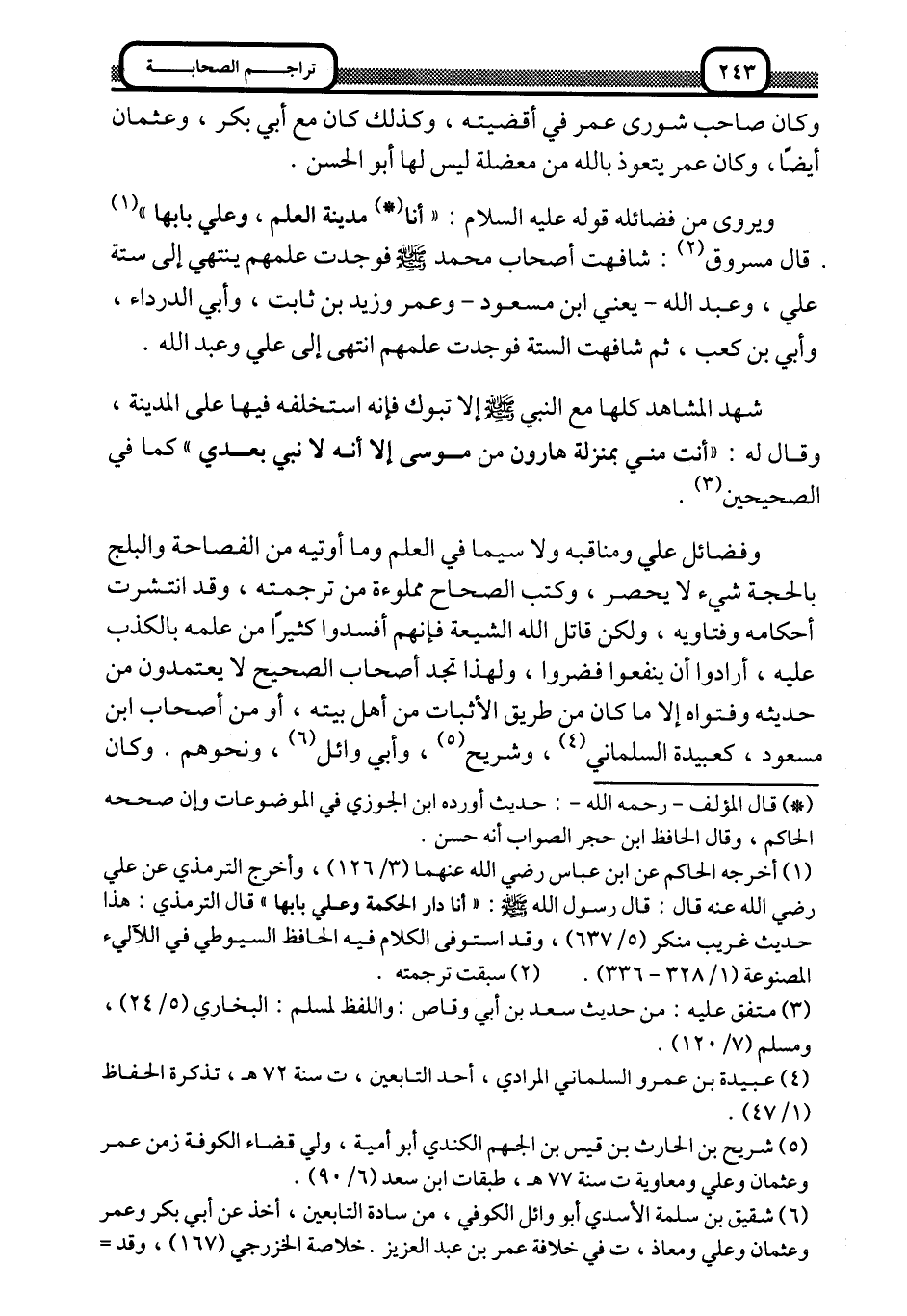 2 أخرجه الحاكم عن ابن عباس -رضي الله عنهما "3/ 126"، وأخرج الترمذي عن علي -رضي الله عنه- قال: قال رسول الله -صلى الله عليه وسلم: "أنا دار الحكمة وعلي بابها" قال الترمذي: هذا حديث غريب منكر "5/ 637"، وقد استوفى الكلام فيه الحافظ السيوطي في اللآليء المصنوعة "1/ 328-336".