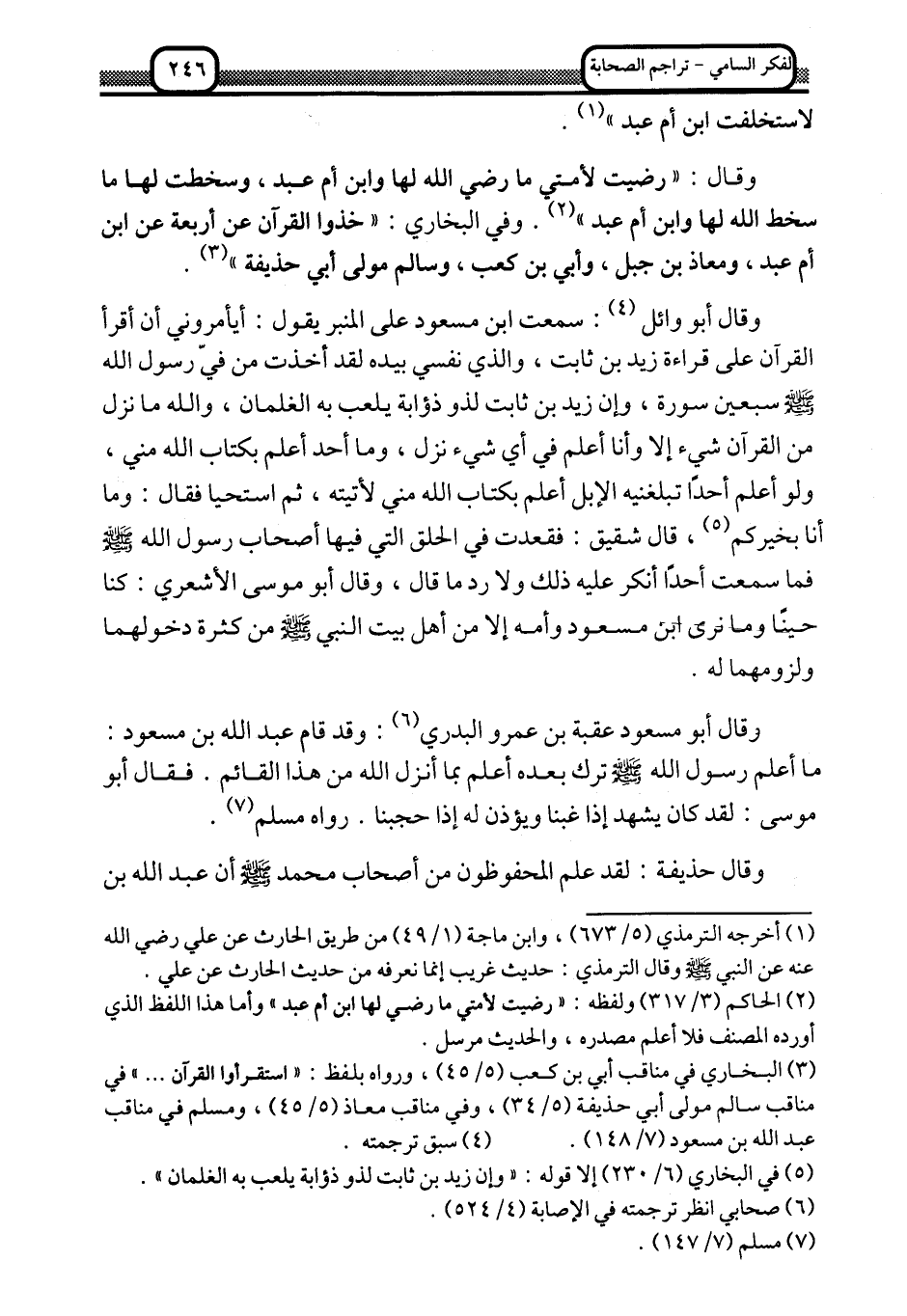 وقال: "رضيت لأمتي ما رضي الله عنه وابن أم عبد، وسخطت لها ما سخط الله لها وابن أم عبد" 2. في البخاري: "خذو القرآن عن أربعة, عن ابن أم عبد، ومعاذ بن جبل، وأُبَيّ بن كعب، وسالم مولى أبي حذيفة" 3.