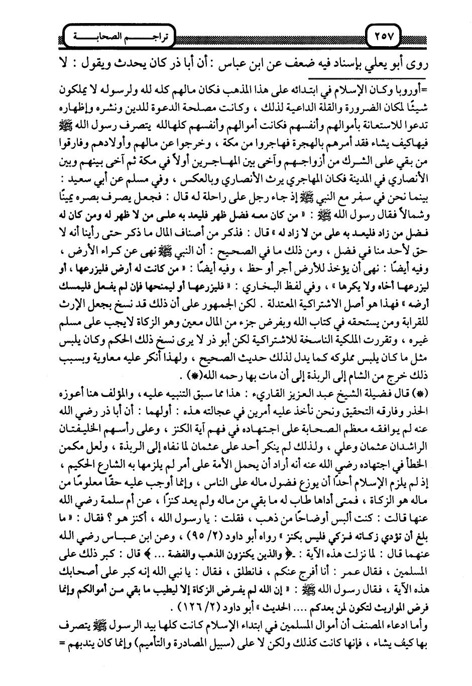 * قال فضيلة الشيخ عبد العزيز القارئ: هذا مما سبق التنبيه عليه، والمؤلف هنا أعوزه الحذر وفارقه التحقيق, ونحن نأخذ عليه أمرين في عجالته هذه: أولهما: أن أبا ذر -رضي الله عنه- لم يوافقه معظم الصحابة على اجتهاده في فهم آية الكنز، وعلى رأسهم الخليفتان الراشدان عثمان وعلي، ولذلك لم ينكر أحد على عثمان لما نفاه إلى الربذة، ولعل مكمن الخطأ في اجتهاده -رضي الله عنه- أنه أراد أن يحمل الأمة على أمر لما يلزمها بها لشارع الحكيم، إذ لم يلزم الإسلام أحدًا أن يوزع فضول ماله على الناس، وإنما أوجب عليه حقًّا معلومًا من ماله هو الزكاة، فمتى أداها طاب له ما بقي من ماله, ولم يعد كنزًا، عن أم سلمة -رضي الله عنها- قالت: كنت ألبس أوضاحًا من ذهب، فقلت: يا رسول الله، أكنز هو؟ فقال: "ما بلغ أن تؤدي زكاته فزكي فليس بكنز" رواه أبو داود "2/ 95"، وعن ابن عباس -رضي الله عنهما- قال: لما نزلت هذه الآية: {وَالَّذِينَ يَكْنِزُونَ الذَّهَبَ وَالْفِضَّةَ} قال: كبر ذلك على المسلمين، فقال عمر: أنا أفرج عنكم، فانطلق، فقال: يا نبي الله, إنه كبر على أصحابك فرض المواريث لتكون لمن بعدكم ... الحديث" أبو داود "2/ 126".