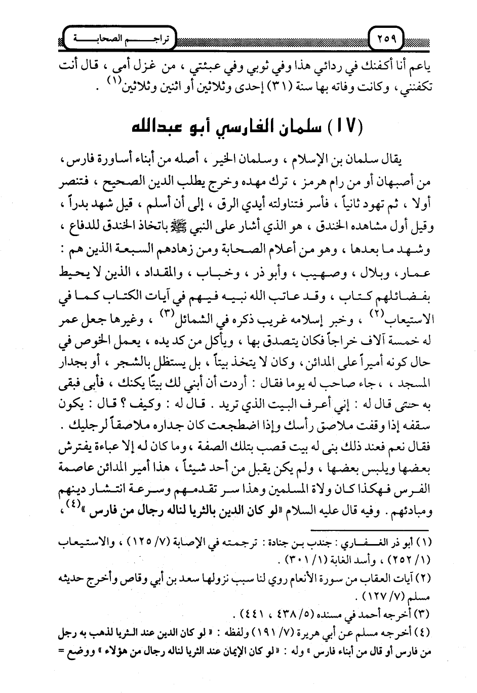 يقال سلمان بن الإسلام، وسلمان الخير، أصله من أبناء أساروة فارس، من أصبهان أو من رام هرمز، ترك مهده وخرج يطلب الدين الصحيح، فتنصَّر أولًا، ثم تهوَّد ثانيًا، فأُسِرَ فتناولته أيدي الرق، إلى أن أسلم، قيل: شهد بدرًا, وقيل: أول مشاهده الخندق، هو الذي أشار على النبي -صلى الله عليه وسلم- باتخاذ الخندق للدفاع، وشهد ما بعدها، وهو من أعلام الصحابة ومن زهادهم السبعة الذين هم: عمار، وبلال، وصهيب، وأبو ذر، وخباب، والمقداد، الذين لا يحيط بفضائلهم كتاب، وقد عاتب الله نبيه فيهم في آيات الكتاب كما في الاستيعاب1، وخبر إسلامه غريب ذكره في الشمائل2 وغيرها. جعل عمر له خمسة آلاف خراجًا, فكان يتصدق بها، ويأكل من كد يده، يعمل الخوص في حال كونه أميرًا على المدائن، وكان لا يتخذ بيتًا، بل يستظل بالشجر، أو بجدار المسجد، جاء صاحب له يومًا فقال: أردت أن أبني لك بيتًا يكنك، فأبى, فبقى به حتى قال له: إني أعرف البيت الذي تريد. قال له: وكيف؟ قال: يكون سقفه إذا وقفت ملاصقة رأسك, وإذا اضجعت كان جداره ملاصقًا لرجليك.