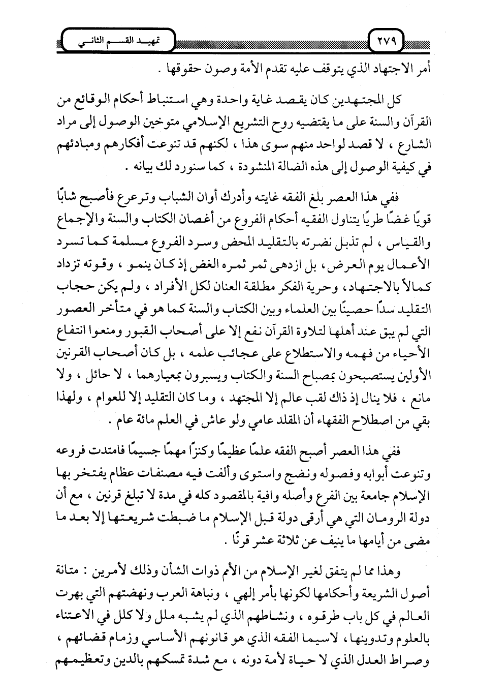 ففي هذا العصر بلغ الفقه غايته, وأدرك أوان الشباب وترعرع, فأصبح شابًّا قويًّا غضًّا طريًّا, يتناول الفقيه أحكام الفروع من أغصان الكتاب والسنة والإجماع والقياس، لم تذبل نضرته بالتقليد المحض وسرد الفروع مسلَّمة كما تسرد الأعمال يوم العرض، بل ازدهى ثمر ثمره الغض إذ كان النمو، وقوته تزداد كمالًا بالاجتهاد، وحرية الفكر مطلقة العنان لكل الأفراد، ولم يكن حجاب التقليد سدًّا حيينًا بين العلماء وبين الكتاب والسنة كما هو في متأخر الصعور التي لم يبق عند أهلها لتلاوة القرآن نفع إلّا على أصحاب القبور, ومنعوا انتفاع الأحياء من فهمه, والاستطلاع على عجائب علمه، بل كان أصحاب القرنين الأولين يستصبحون بمصباح السنة والكتاب ويسيرون بمعيارهما، لا حائل، ولا مانع، فلا ينال إذ ذاك لقب عالم إلا المجتهد، وما كان القليد إلّا للعوام، ولهذا بقي من اصطلاح الفقهاء أن المقلد عامي ولو عاش في العلم مائة عام.