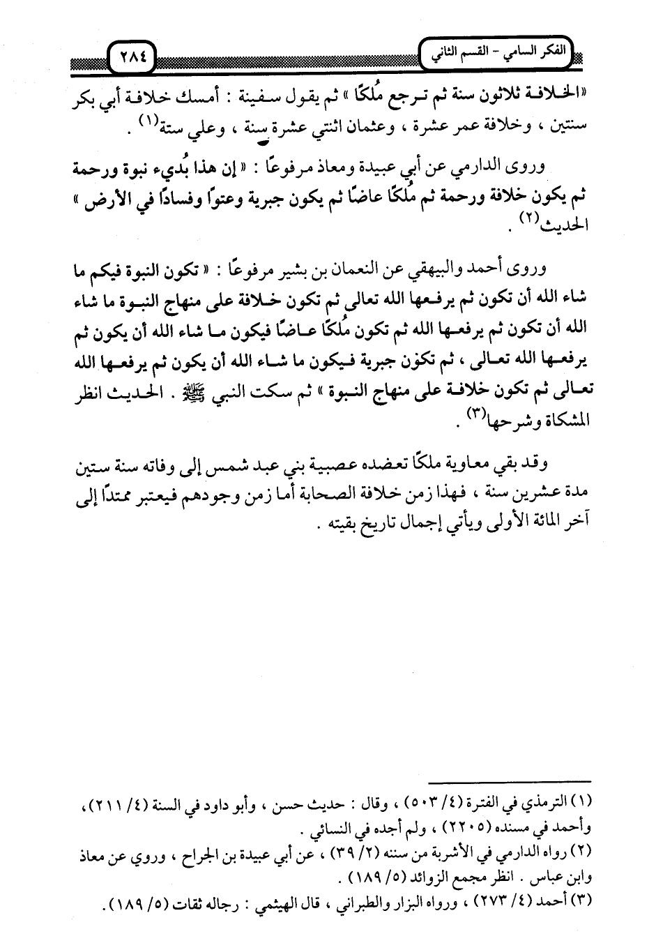 وروى أحمد والبيهقي عن النعمان بن بشير مرفوعًا: "تكون النبوة فيكم ما شاء الله أن تكون ثم يرفعها الله تعالى, ثم تكون خلافة على منهاج النبوة ما شاء الله أن تكون ثم يرفعها الله, ثم تكون ملكًا عاضًّا فيكون ما شاء الله أن كون ثم يرفعها الله تعالى، ثم تكون جبرية فيكون ما شاء الله أن يكون ثم يرفعها الله تعالى, ثم تكون خلافة على منهاج النبوة" ثم سكت النبي -صلى الله عليه وسلم. الحديث انظر المشكاة وشرحها3.