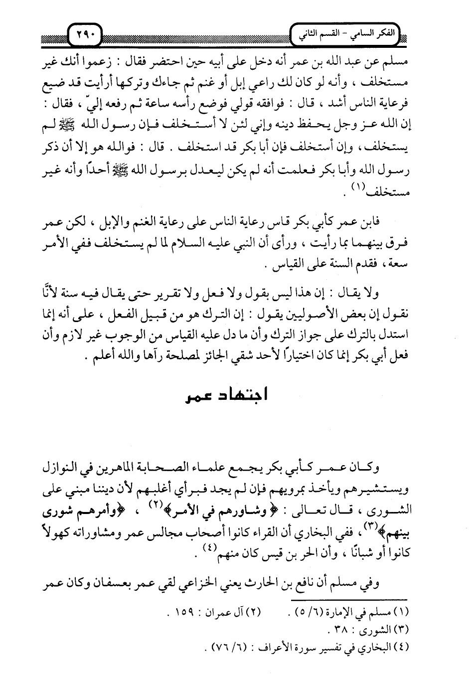 وكان عمر كأبي بكر يجمع علماء الصحابة الماهرين في النوازل ويستشيرهم ويأخذ بمرويهم, فإن لم يجد فبرأي أغلبهم؛ لأن ديننا منبيٌّ على الشورى، قال تعالى: {وَشَاوِرْهُمْ فِي الْأَمْرِ} 1، {وَأَمْرُهُمْ شُورَى بَيْنَهُمْ} 2 ففي البخاري أن القراء كانوا أصحاب مجالس عمر ومشارواته, كهولًا كانوا أو شبابًا، وأن الحر بن قيس كان منهم3.
