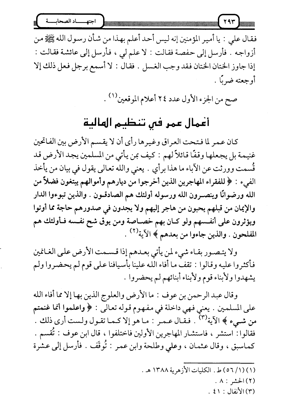 كان عمر لما فتحت العراق وغيرها, رأى أن لا يقسِّم الأرض بين الفاتحين غنيمة, بل يجعلها وقفًا قائلًا لهم: كيف بمن يأتي من المسلمين يجد الأرض قد قسِّمت وورثت عن الآباء ما هذا برأي. يعني: والله تعالى يقول في بيان من يأخذ الفيء: {لِلْفُقَرَاءِ الْمُهَاجِرِينَ الَّذِينَ أُخْرِجُوا مِنْ دِيارِهِمْ وَأَمْوَالِهِمْ يَبْتَغُونَ فَضْلًا مِنَ اللَّهِ وَرِضْوَانًا وَيَنْصُرُونَ اللَّهَ وَرَسُولَهُ أُولَئِكَ هُمُ الصَّادِقُونَ، وَالَّذِينَ تَبَوَّءُوا الدَّارَ وَالْإِيمَانَ مِنْ قَبْلِهِمْ يُحِبُّونَ مَنْ هَاجَرَ إِلَيْهِمْ وَلَا يَجِدُونَ فِي صُدُورِهِمْ حَاجَةً مِمَّا أُوتُوا وَيُؤْثِرُونَ عَلَى أَنْفُسِهِمْ وَلَوْ كَانَ بِهِمْ خَصَاصَةٌ وَمَنْ يُوقَ شُحَّ نَفْسِهِ فَأُولَئِكَ هُمُ الْمُفْلِحُونَ، وَالَّذِينَ جَاءُوا مِنْ بَعْدِهِمْ} الآية2.