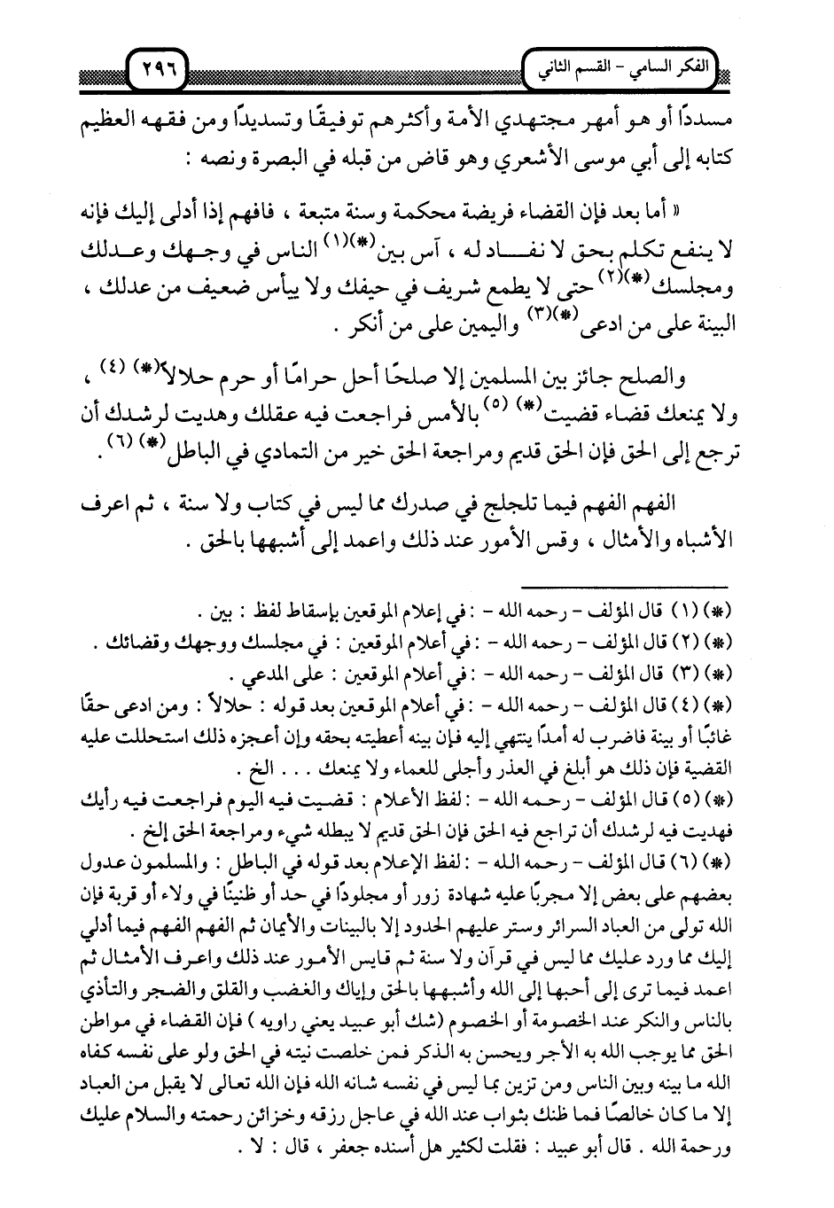 11، 12 قال المؤلف -رحمه الله: لفظ الإعلام بعد قوله في الباطل: والمسلمون عدول بعضهم على بعض, إلا مجربًا عيله شهادة زور, أو مجلودًا في حد, أو ظنينًا في ولاء أو قربة, فإن الله تولى من العباد السرائر, وستر عليهم الحدود إلّا بالبينات والأيمان, ثم الفهم الفهم فيما أدلي إليك مما ورد عليك مما ليس في قرآن ولا سنة, ثم قايس الأمور عند ذلك, واعرف الأمثال, ثم اعمد فيما ترى إلى أحبها إلى الله وأشبهها بالحق, وإياك والغضب والقلق والضجر والتأذي بالناس والنكر عند الخصومة أو الخصوم "شك أبو عبيد يعني روايه" فإن القضاء في مواطن الحق مما يوجب الله به الأجر, ويحسن به الذكر, فمن خلصت نيته في الحق ولو على نفسه كفاه الله ما بينه وبين الناس, ومن تزين بما ليس في نفسه شأنه الله, فإن الله تعالى لا يقبل من العباد إلّا ما كان خالصًا, فما ظنك بثواب عند الله في عاجل رزقه وخزائن رحمته, والسلام عليك ورحمة الله. قال أبو عبيد: فقلت لكثير: هل أسنده جعفر. قال: لا.