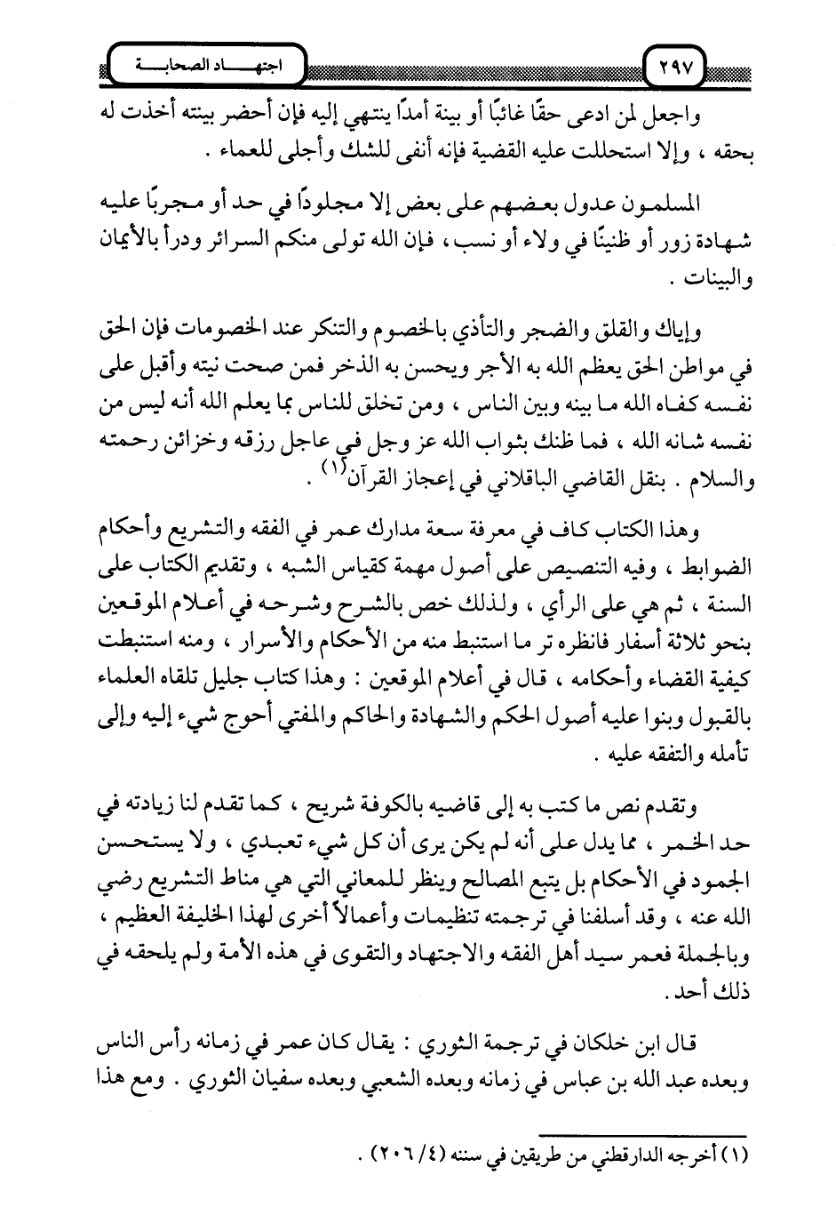 وتقدَّم نصّ ما كتب به إلى قاضيه بالكوفة شريح، كما تقدَّم لنا زيادته في حد الخمر، مما يدل على أنه لم يكن يرى أن كل شيء تعبدي، ولا يستحسن الجمود في الأحكام, بل يتبع المصالح وينظر للمعاني التي هي مناط التشريع -رضي الله عنه، وقد أسلفنا في ترجمته تنظيمات وأعمالًا أخرى لهذا الخليفة العظيم، وبالجملة فعمر سيد أهل الفقه والاجتهاد والتقوى في هذه الأمة, ولم يلحقه في ذلك أحد.
