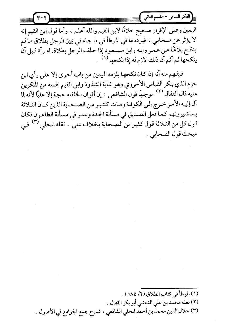 فيفهم منه أنه إذا كان نكحها يلزمه اليمين, من باب أحرى إلّا على رأي ابن حزم الذي ينكر القياس الأحروي, وهو غاية الشذوذ, وابن القيم نفسه من المنكرين عليه, قال القفال2 موجهًا قول الشافعي: إن أقوال الخلفاء حجة إلّا عليًّا؛ لأنه لما آل إليه الأمر خرج إلى الكوفة, ومات كثير من الصحابة الذين كان الثلاثة يستشيرونهم, كما فعل الصديق في مسألة الجدة, وعمر في مسألة الطاعون, فكان قول كل من الثلاثة قول كثير من الصحابة يخلف علي. نقله المحلي3 في مبحث قول الصحابي.