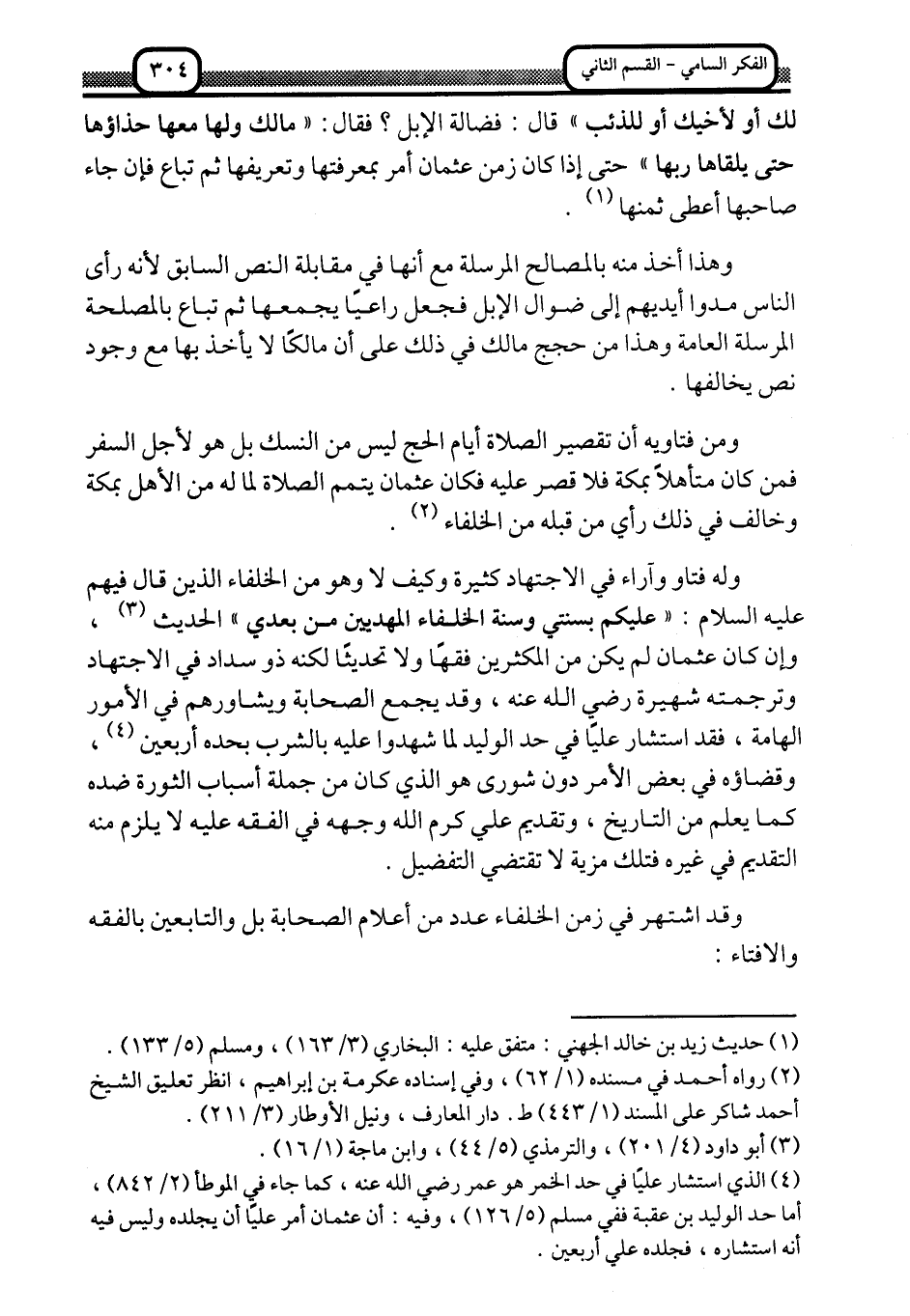 وله فتاوٍ وآراء في الاجتهاد كثيرة, وكيف لا وهو من الخلفاء الذين قال فيهم عليه السلام: "عليكم بسنتي وسنة الخلفاء المهديين من بعدي" الحديث3، وإن كان عثمان لم يكن من المكثرين فقهًا ولا تحديثًا, لكنه ذو سداد في الاجتهاد, وترجمته شهيرة -رضي الله عنه, وقد يجمع الصحابة ويشاورهم في الأمور الهامة، فقد استشار عليًّا في حد الوليد لما شهدوا عليه بالشرب بحده أربعين4، وقضاؤه في بعض الأمر دون شورى هو الذي كان من جملة أسباب الثورة ضده كما يُعْلَم من التاريخ، وتقديم عليّ -كرم الله وجهه- في الفقه عليه لا يلزم منه التقديم في غيره, فتلك مزية لا تقتضي التفضيل.