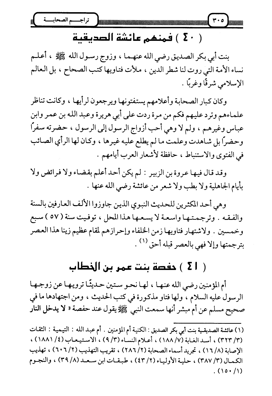 1 عائشة الصديقة بنت أبي بكر الصديق: الكنية أم المؤمنين, أم عبد الله, التيمية: الثقات "3/ 323"، أسد الغابة "7/ 188"، أعلام النساء "3/ 9"، والاستيعاب "4/ 1881"، الإصابة "8/ 16"، تجريد أسماء الصحابة "2/ 286"، تقريب التهذيب "2/ 606"، تهذيب الكمال "3/ 387"، حلية الأولياء "2/ 43"، طبقات ابن سعد "8/ 39"، والنجوم "1/ 150".