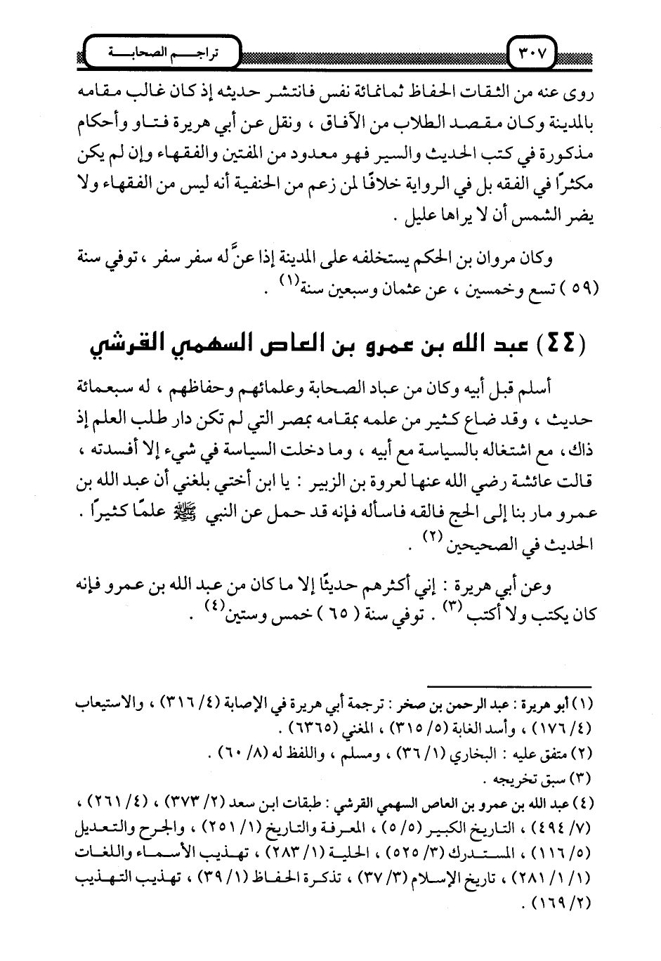 3 عبد الله بن عمرو بن العاص السهمي القرشي: طبقات ابن سعد "2/ 373"، "4/ 261"، "7/ 494"، التاريخ الكبير "5/ 5"، المعرفة والتاريخ "1/ 251"، والجرح والتعديل "5/ 116"، والمستدرك "3/ 525"، الحلية "1/ 283"، تهذيب الأسماء واللغات "1/ 1/ 281"، تاريخ الإسلام "3/ 37"، تذكرة الحفاظ "1/ 39"، تهذيب التهذيب "2/ 169".