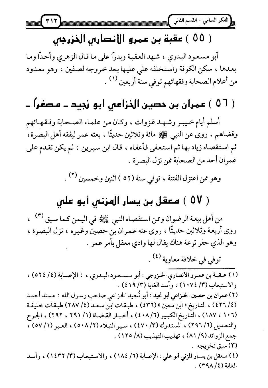 2 عمران بن حصين الخزاعي أبو نجيد: أبو نجيد الخزاعي صاحب رسول الله: مسند أحمد "4/ 426"، التاريخ "ابن معين" "436"، طبقات ابن سعد "4/ 287", طبقات خليفة "106، 187"، التاريخ الكبير "6/ 408"، أخبار القضاة "1/ 291، 292"، الجرح والتعديل "6/ 296"، المستدرك "3/ 470"، سير النبلاء "2/ 508"، والعبر "1/ 57"، مجمع الزوائد "9/ 125".