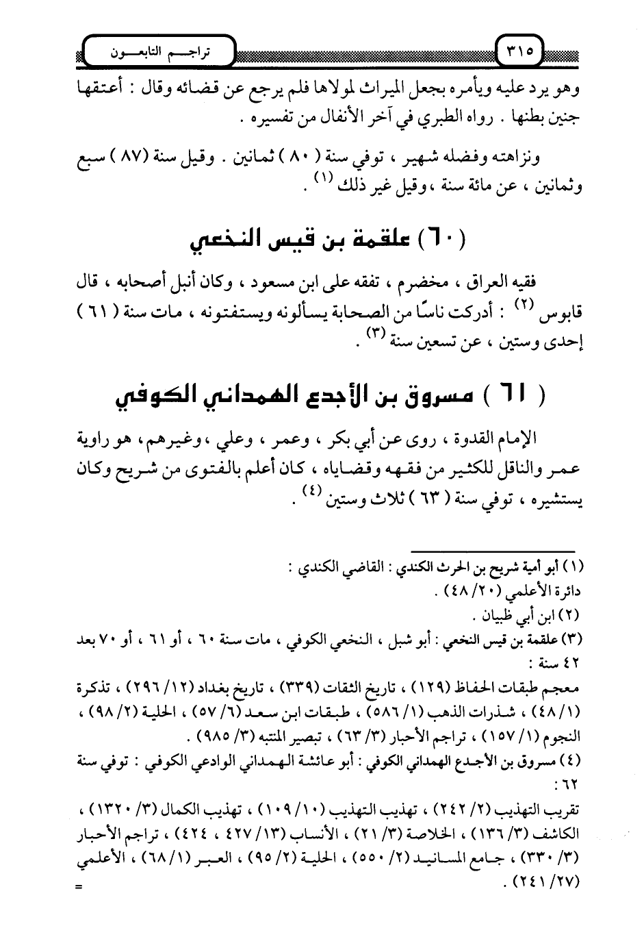 3 مسروق بن الأجدع الهمداني الكوفيّ, أبو عائشة الهمداني الوادعي الكوفي: توفي سنة 62. تقريب التهذيب "2/ 242"، تهذيب التهذيب "10/ 109"، تهذيب الكمال "3/ 1320"، الكاشف:"3/ 136"، الخلاصة "3/ 21"، الأنساب "13/ 427، 424"، تراجم الأحبار "3/ 330"، جامع المسانيد "2/ 550"، الحلية "2/ 95"، العبر "1/ 68"، الأعلمي "274/ 241".