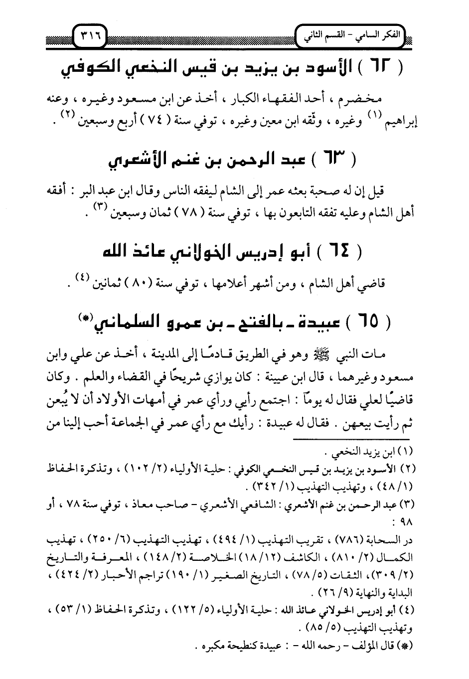 6 عبيدة بن عمرو السلماني: أبو عمرو, أبو مسلم السلماني- الكوفي - الهمداني- المرادي، أسلم ولم ير النبي -صلى الله عليه وسلم، مات قبل سنة 70، أو 72 أو بعدها. شذرات الذهب "1/ 78"، طبقات ابن سعد "6/ 62"، طبقات القراء "1/ 498"، العبر "1/ 89"، اللباب "1/ 552", التاريخ لابن معين "3/ 387"، تقريب التهذيب "1/ 547"، تهذيب التهذيب "7/ 84"، تهذيب الكمال "2/ 898"، الكاشف "2/ 242", الخلاصة "2/ 207"، تراجم الأحبار "3/ 17، 93".