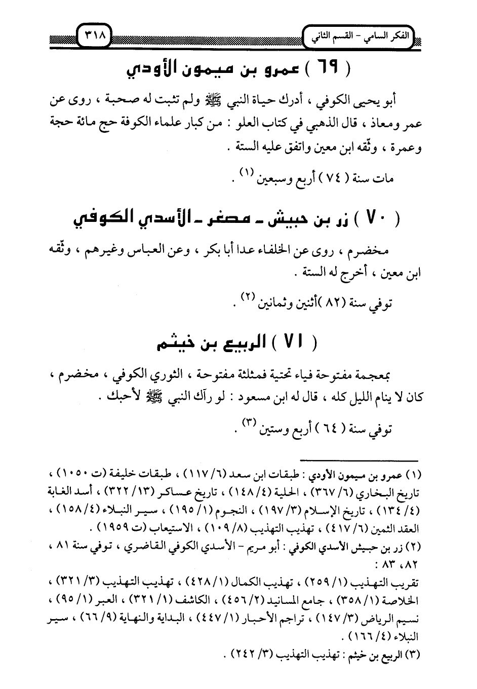 2 زر بن حبيش الأسدي الكوفي: أبو مريم - الأسدي الكوفي القاضري، توفي سنة 81، 82، 83: تقريب التهذيب "1/ 259"، تهذيب الكمال "1/ 428"، تهذيب التهذيب "3/ 321"، الخلاصة "1/ 358"، جامع المسانيد "2/ 456"، الكاشف "1/ 321"، العبر "1/ 95"، نسيم الرياض "3/ 147"، تراجم الأحبار "1/ 447"، البداية والنهاية "9/ 66"، سير النبلاء "4/ 166".