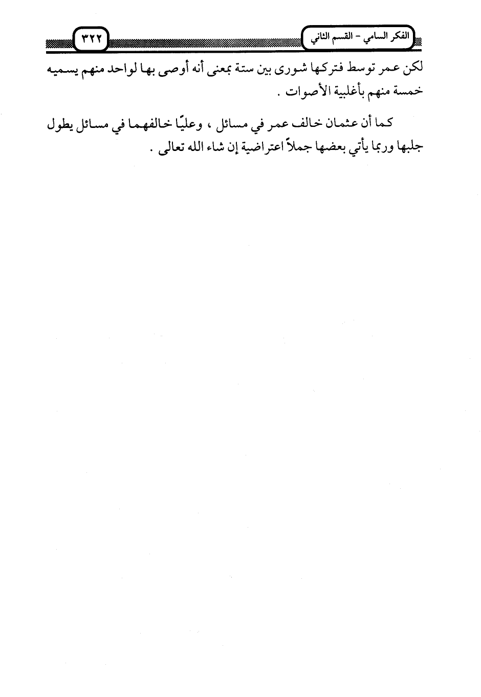 لكن عمر توسَّط فتركها شورى بين ستة, بمعنى أنه أوصى بها لواحد منهم, يسميه خمسة منهم بأغلبية الأصوات.