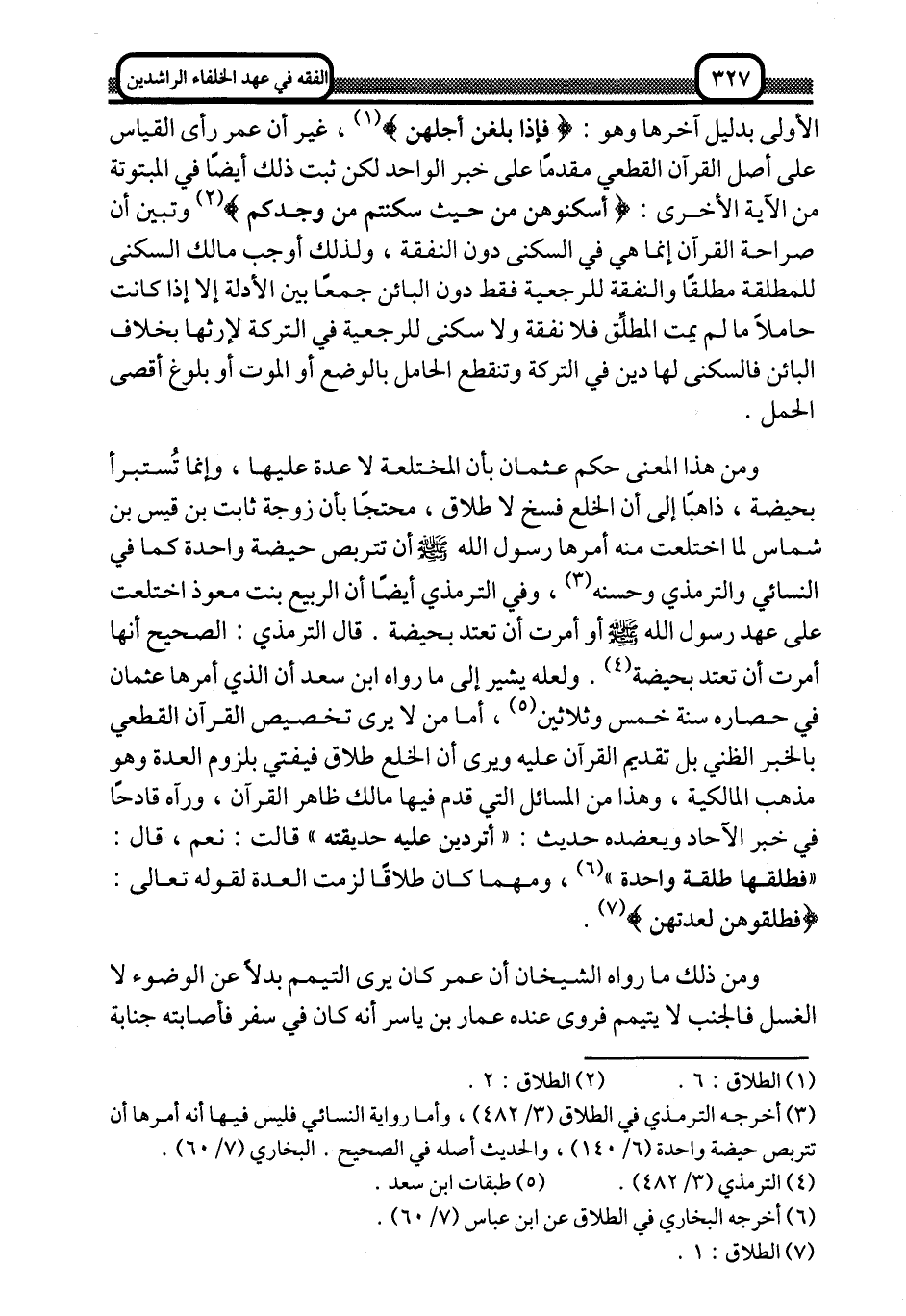 ومن هذا المعنى حكم عثمان بأن المختلعة لا عدَّة عليها، وإنما تستبرأ بحيضة، ذاهبًا إلى أن الخلع فسخ لا طلاق، محتجًا بأن زوجة ثابت بن قيس بن شماس لما اختلعت منه أمرها رسول الله -صلى الله عليه وسلم- أن تتربَّص حيضة واحدة كما في النسائي والترمذي وحسنه3، وفي الترمذي أيضًا أن الربيع بنت معوذ اختلعت على عهد رسول الله -صلى الله عليه وسلم, أو أمرت أن تعتدَّ بحيضة. قال الترمذي: الصحيح أنها أمرت أن تعتد بحيضة4, ولعله يشير إلى ما رواه ابن سعد أن الذي أمرها عثمان في حصاره سنة خمسة وثلاثين5، أما من لا يرى تخصيص القرآن القطعي بالخبر الظني بل تقديم القرآن عليه, ويرى أن الخلع طلاق, فيفتي بلزوم العدة وهو مذهب المالكية، وهذا من المسائل التي قدَّم فيها مالك ظاهر القرآن، ورآه قادحًا في خبر الآحاد ويعضده حديث: "أتردين عليه حديقته" قالت: نعم، قال: "فطلقها طلقة واحدة" 6، ومهما كان طلاقًا لزمت العدة لقوله تعالى: {فَطَلِّقُوهُنَّ لِعِدَّتِهِنَّ} 7.