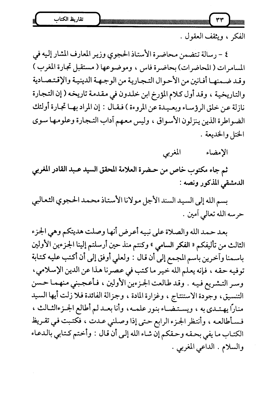 بعد حمد الله والصلاة على نبيه, أعرض أنها وصلت هديتكم, وهي الجزء الثالث من تأليفكم "الفكر السامي", وكنتم منذ حين أرسلتم إلينا الجزءين الأولين باسمنا, وآخرين باسم المجمع, إلى أن قال: ولعلي أوفق إلى أن أكتب عليه كتابة توفيه حقَّه، فإنه يعلم الله خير ما كتب في عصرنا هذا عن الدين الإسلامي، وسر التشريع فيه. وقد طالعت الجزءين الأولين، فأعجبني منهما حسن التنسيق، وجودة الاستنتاج، وغزارة المادة، وجزالة الفائدة, فلا زلت أيها السيد منارًا يهتدى به، ويستضاء بنور علمه، وأنا بعد لم أطالع الجزاء الثالث، فسأطالعه، وأنتظر الجزء الرابع حتى إذ وصلني عدت، فكتبت في تقريظ الكتاب ما يفي بحقه إن شاء الله, إلى أن قال: وأختم كتابي بالدعاء والسلام. الداعي المغربي.