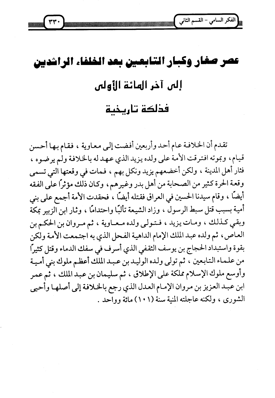 تقدَّم أن الخلافة عام أحد وأربعين أفضت إلى معاوية، فقام بها أحسن قيام، وبموته افترقت الأمة على ولده يزيد الذي عهد له بالخلافة ولم يرضوه، فثار أهل المدينة، ولكن أخضعهم يزيد ونكّل بهم، فمات في وقعتها التي تسمَّى وقعة الحرة كثير من الصحابة من أهل بدر وغيرهم, وكان ذلك مؤثرًا على الفقه أيضًا، وقام سيدنا الحسين في العراق فقتله أيضًا، فحقدت الأمة أجمع على بني أمية بسبب قتل سبط الرسول، وزاد الشيعة تألبًا واحتدامًا، وثار ابن الزبير بمكة وبقي كذلك، ومات يزيد، فتولّى ولده معاوية، ثم مروان بن الحكم بن العاص، ثم ولده عبد الملك الإمام الداهية الفحل الذي به اجتمعت الأمة, ولكن بقوة واستبداد الحجاج بن يوسف الثقفي الذي أسرف في سفك الدماء وقتل كثيرًا من علماء التابعين، ثم تولّى ولده الوليد بن عبد الملك أعظم ملوك بني أمية, وأوسع ملوك الإسلام ممكلة على الإطلاق، ثم سليمان بن عبد الملك، ثم عمر ابن عبد العزيز بن مروان, الإمام العدل الذي رجع بالخلافة إلى أصلها وأحييى الشورى، ولكنه عاجلته المنية سنة "101" مائة وواحد.