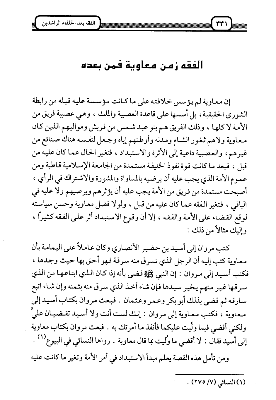 إن معاوية لم يؤسس خلافته على ما كانت مؤسسة عليه قبله من رابطة الشورى الحقيقية، بل أسسها على قاعدة العصبية والملك، وهي عصبية فريق من الأمة لا كلها، وذلك الفريق هم بنو عبد شمس من قريش ومواليهم الذين كان معاوية ولَّاهم ثغور الشام ومدنه وأوطنهم إياه, وجعل لنفسه هناك صنائع من غيرهم، والعصبية داعية إلى الأثرة والاستبداد، فتغيَّر الحال عَمَّا كان عليه من قبل، فبعد ما كانت قوة نفوذ الخليفة مستمدَّة من الجامعة الإسلامية قاطبة, ومن عموم الأمة الذي يجب عليه أن يرضيه بالمساوة والمشورة والاشتراك في الرأي، أصبحت مستمدَّة من فريق من الأمة, يجب عليه أن يؤثرهم ويرضيهم ولا عليه في الباقي، فتغيَّر الفقه عمَّا كان عليه من قبل، ولولا فضل معاوية وحسن سياسته لوقع القضاء على الأمة والفقه، إلا أن وقوع الاستبداد أثَّر على الفقه كثيرًا، وإليك مثالًا من ذلك: