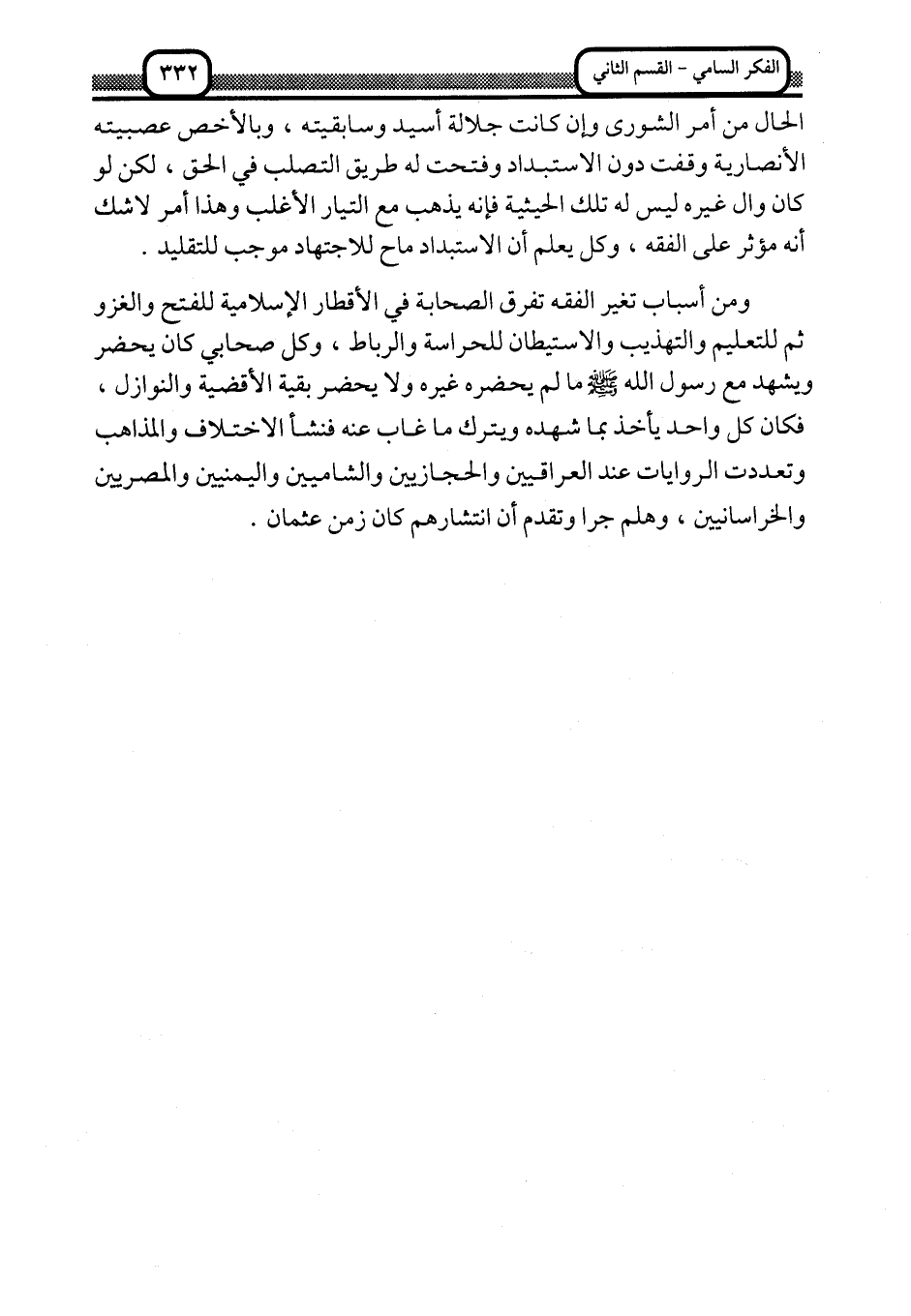 الحال من أمر الشوى, وإن كان جلالة أسيد وسابقيته، وبالأخص عصبيته الأنصارية وقفت دون الاستبداد, وفتحت له طريق التصلب في الحق، لكن لو كان والٍ غيره ليس له تلك الحيثية, فإنه يذهب مع التيار الأغلب, وهذا أمر لا شك أنه مؤثر على الفقه، وكلٌّ يعلم أن الاستبداد ماحٍ للاجتهاد موجب للتقليد.