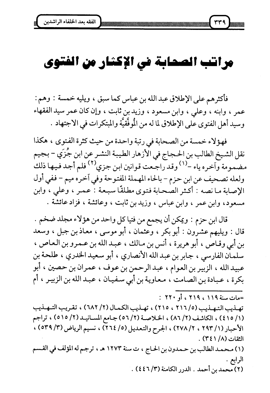 فهؤلاء خمسة من الصحابة في رتبة واحدة من حيث كثرة الفتوى، هكذا نقل الشيخ الطالب بن الحجاج في الأزهار الطيبة, النشر عن ابن جزي -بجيم مضمومة وآخره ياء,1 وقد راجعت قوانين ابن جزي2 فلم أجد فيها ذلك, ولعله تصحيف عن ابن حزم -بالحاء المهملة المفتوحة وفي آخره ميم, ففي أول الإصابة ما نصه: أكثر الصحابة فتوى مطلقًا سبعة: عمر، وعلي، وابن مسعود، وابن عمر، وابن عباس، وزيد بن ثابت، وعائشة، فزاد عائشة.