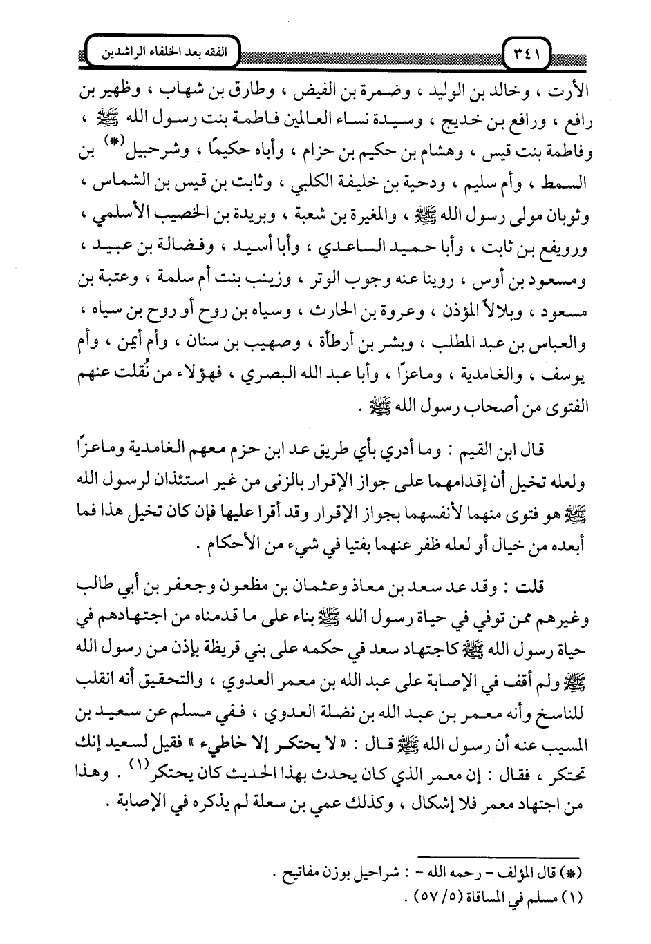 قلت: وقد عدَّ سعد بن معاذ وعثمان بن مظعون وجعفر بن أبي طالب وغيرهم ممّن توفي في حياة رسول الله -صلى الله عليه وسلم, بناء على ما قدمناه من اجتهادهم في حياة رسول الله -صلى الله عليه وسلم؛ كاجتهاد سعد في حكمه على بني قريظة بإذنٍ من رسول الله -صلى الله عليه وسلم, ولم أقف على الإصابة على عبد الله بن معمر العدوي، والتحقيق أنه أنقلب للناسخ, وأنه معمر بن عبد الله بن نضلة العدوين, ففي مسلم عن سعيد بن المسيب عنه, أن رسول الله -صلى الله عليه وسلم- قال: "لا يحتكر إلا خاطيء" فقيل لسعيد: إنك تحتكر، فقال: إن معمر الذي كان يحدث بهذا الحديث كان يحتكر2, وهذا من اجتهاد معمر فلا إشكال، وكذلك عمي بن سعلة لم يذكره في الإصابة.