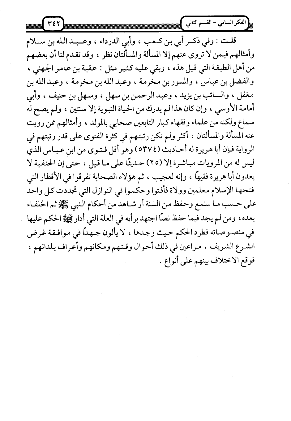 قلت: وفي ذكر أُبَيّ كعب، وأبي الدرداء، وعبد الله بن سلام وأمثالهم, فيمات لا تروى عنهم إلا المسألة والمسألتان نظر، وقد تقدَّم لنا أن بعضهم من أهل الطبقة التي قبل هذه، وبقي عليه كثير مثل: عقبة بن عامل الجهني, والفضل بن عباس، والمسور بن مخرمة، وعبد الله بن مخرمة، وعبد الله بن مغفل، والسائب بن يزيد، وعبد الرحمن بن سهل، وسهل بن حنيف، وأبي أمامة الأوسي، وإن كان هذا لم يدرك من الحياة النبوية إلا سنتين، ولم يصح له سماع, ولكنه من علماء وفقهاء كبار التابعين صحابي بالمولد، وأمثالهم ممن رويت عنه المسألة والمسألتان, أكثر ولم تكن رتبتهم في كثرة الفتوى على قدر رتبتهم في الرواية, فإن أبا هريرة له أحاديث "5374", وهو أقل فتوى من ابن عباس الذي ليس له من المرويات مباشرة إلا "25" حديثًا على ما قيل، حتى إن الحنفية لا يعدون أبا هريرة فقيهًا، وإنه لعجيب، ثم هؤلاء الصحابة تفرقوا في الأقطار التي فتحها الإسلام معلمين وولاة, فأفتوا وحكموا في النوازل التي تجددت, كل واحد على حسب ما سمع وحفظ من السنة, أو شاهد من أحكام النبي -صلى الله عليه وسلم, ثم الخلفاء بعده، ومن لم يجد فيما حفظ نصًّا اجتهد برأيه في العلة التي أدار النبي -صلى الله عليه وسلم- الحكم عليها في منصوصاته, فطرد الحكم حيث وجدها، لا يألون جهدًا في موافقة غرض الشرع الشريف، مراعين في ذلك أحوال وقتهم ومكانهم وأعراف بلدانهم، فوقع الاختلاف بينهم على أنواع.