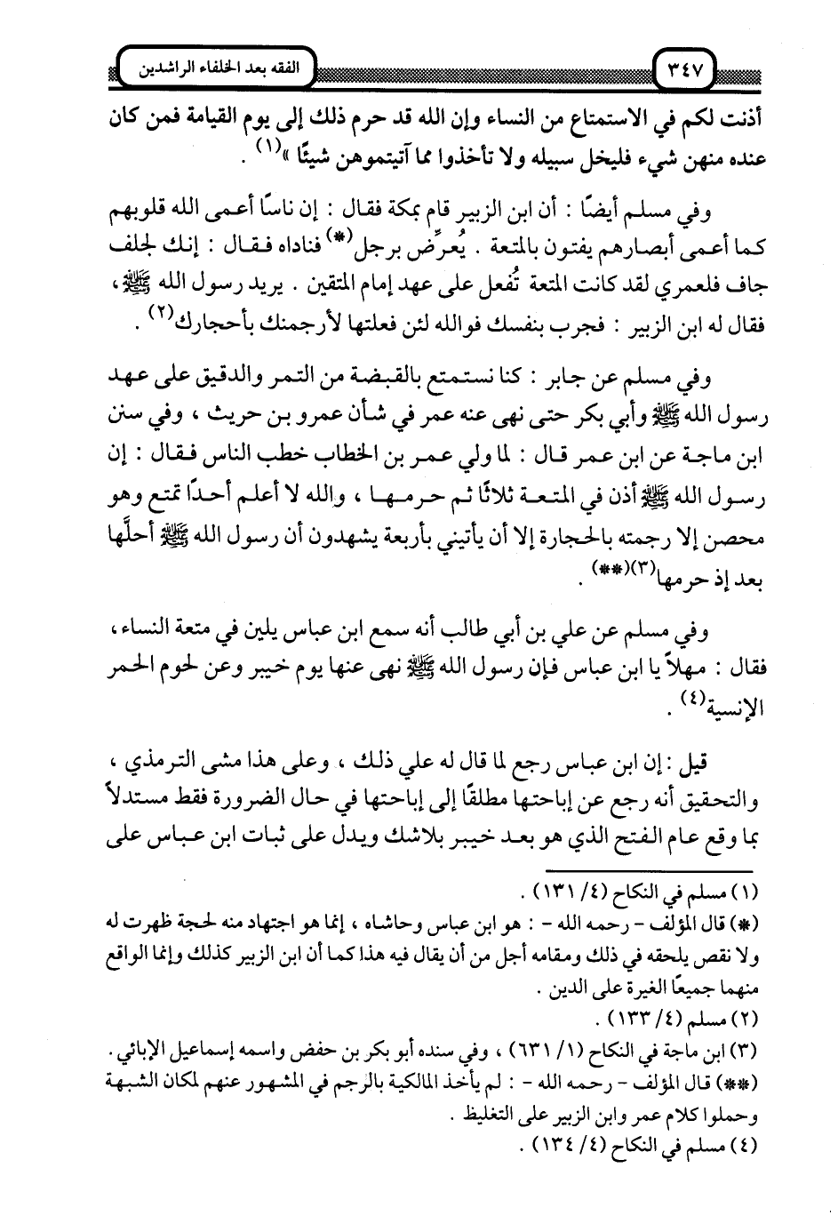 وفي مسلم عن جابر: كنا نستمتع بالقبضة من التمر والدقيق على عهد رسول الله -صلى الله عليه وسلم- وأبي بكر, حتى نهى عنه عمر في شأن عمرو بن حريث، وفي سنن ابن ماجه عن ابن عمر قال: لما ولي عمر بن الخطاب خطب الناس فقال: إن رسول الله -صلى الله عليه وسلم- أذن في المتعة ثلاثًا ثم حرمها، والله لا أعلم أحدًا تمتَّع وهو محصن إلا رجمته بالحجارة, إلا أن يأتيني بأربعة يشهدون أن رسول الله -صلى الله عليه وسلم- أحلَّها بعد إذ حرمها4، 5.